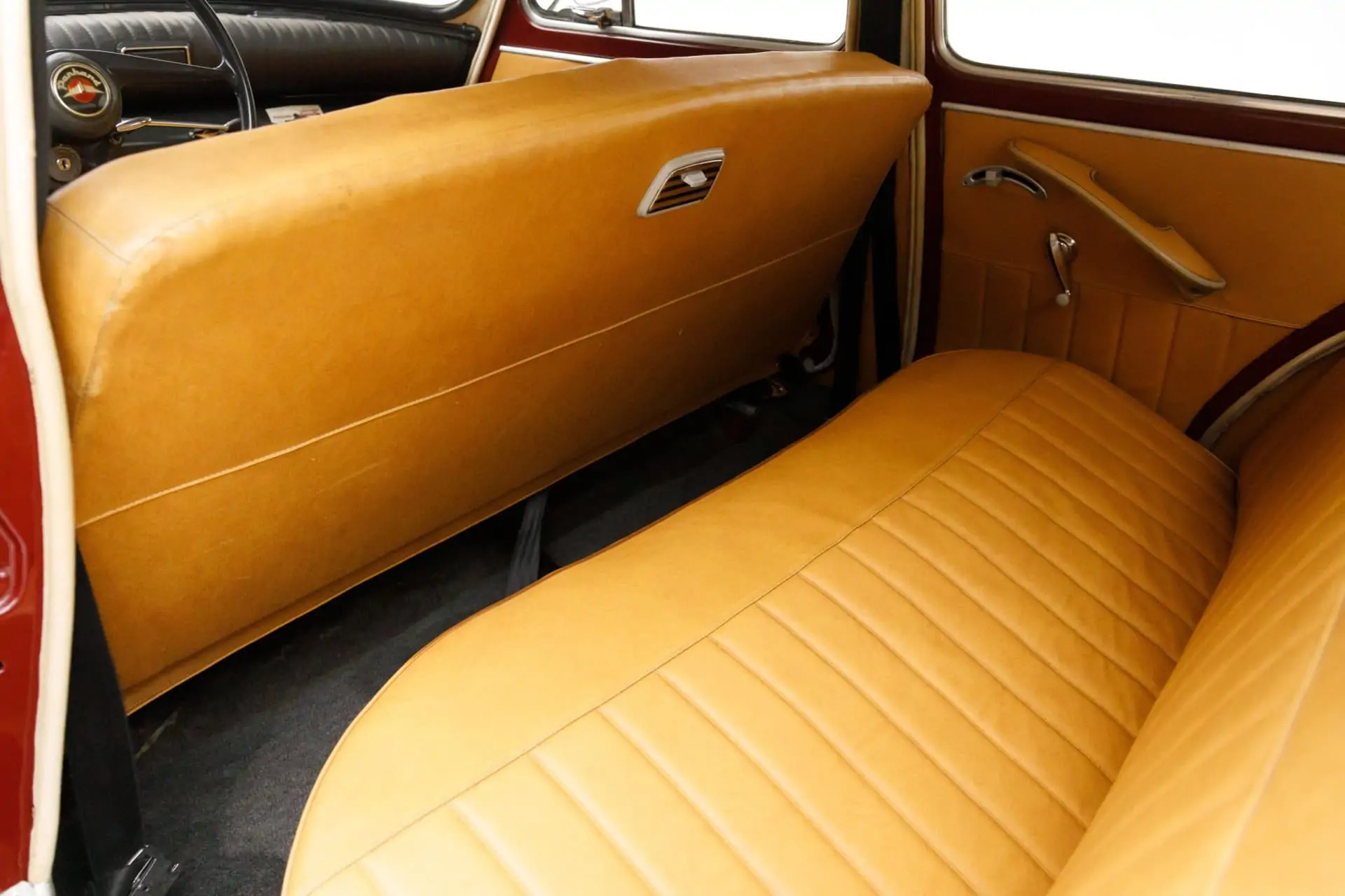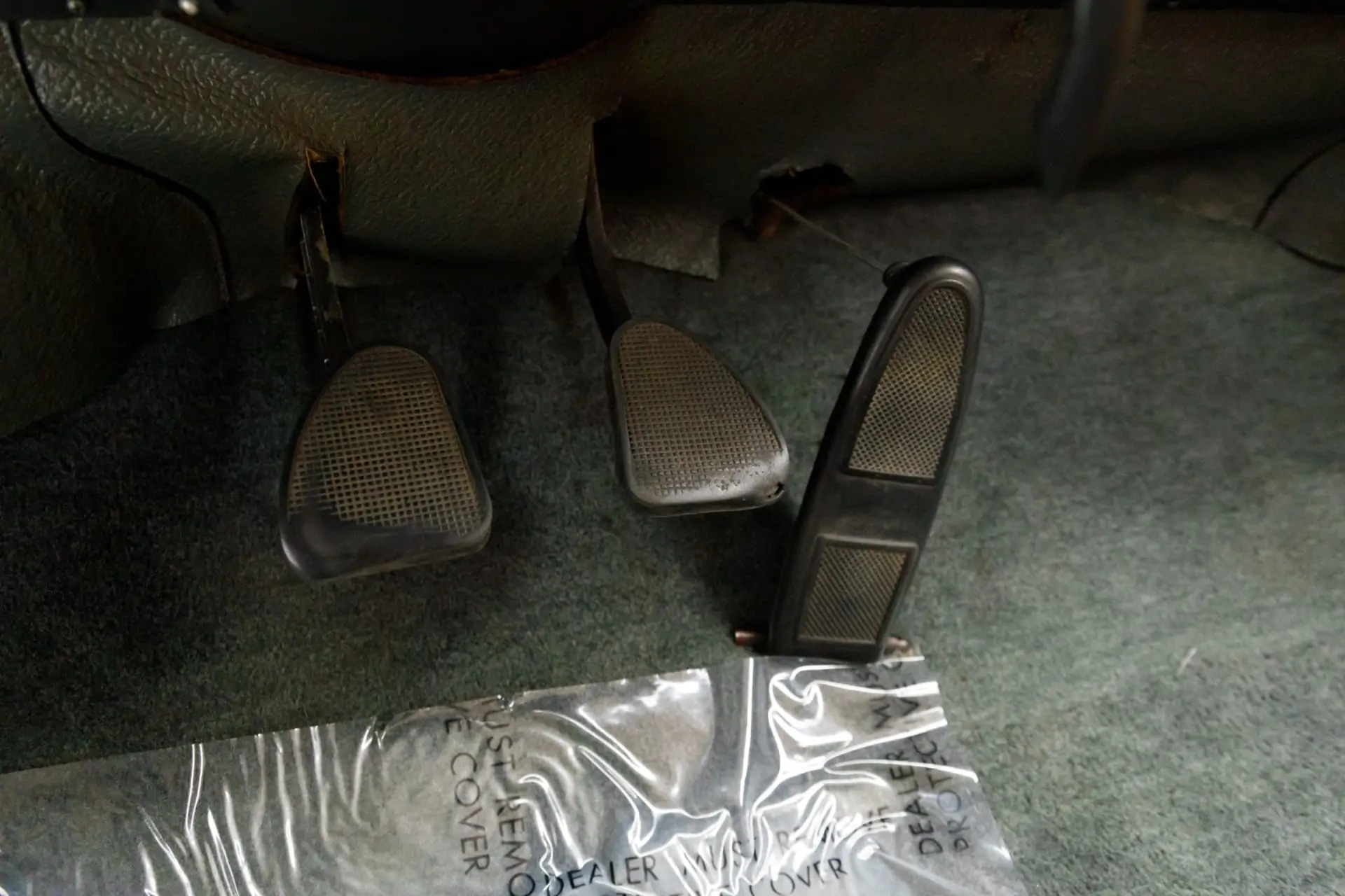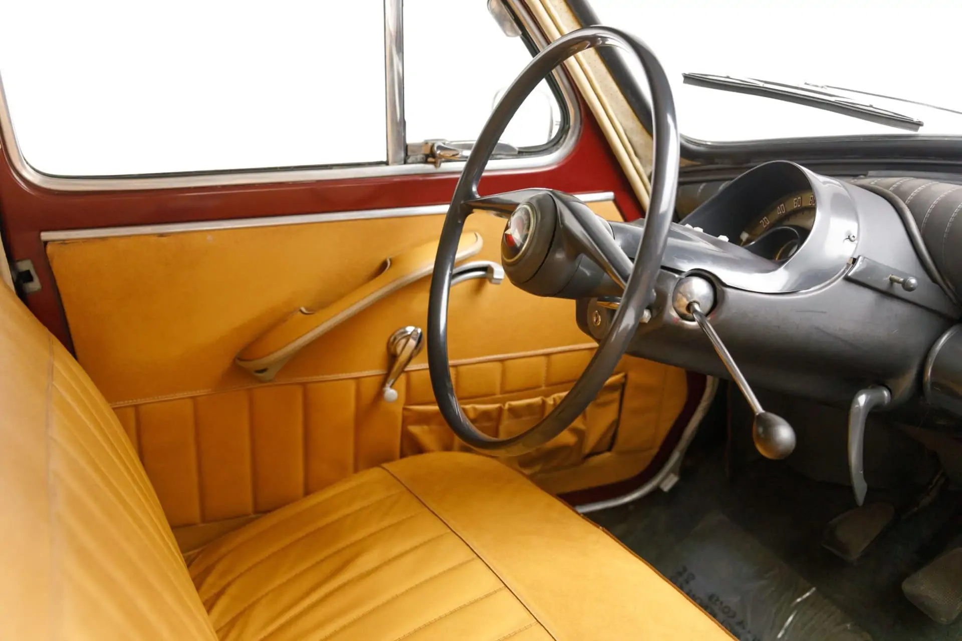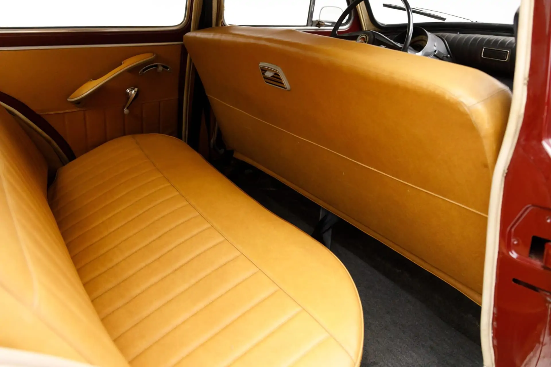 Les banquettes et les panneaux de porte sont garnis de vinyle beige, et le tableau de bord noir comporte une partie supérieure rembourrée et trois compartiments de rangement. Un seul levier actionne les clignotants, les phares et le klaxon, tandis que des interrupteurs situés sur la colonne de direction activent les essuie-glaces et les feux de stationnement de chaque côté de la voiture. Des ceintures de sécurité abdominales sont prévues pour les occupants avant, et des tapis noirs recouvrent les planchers et le coffre.