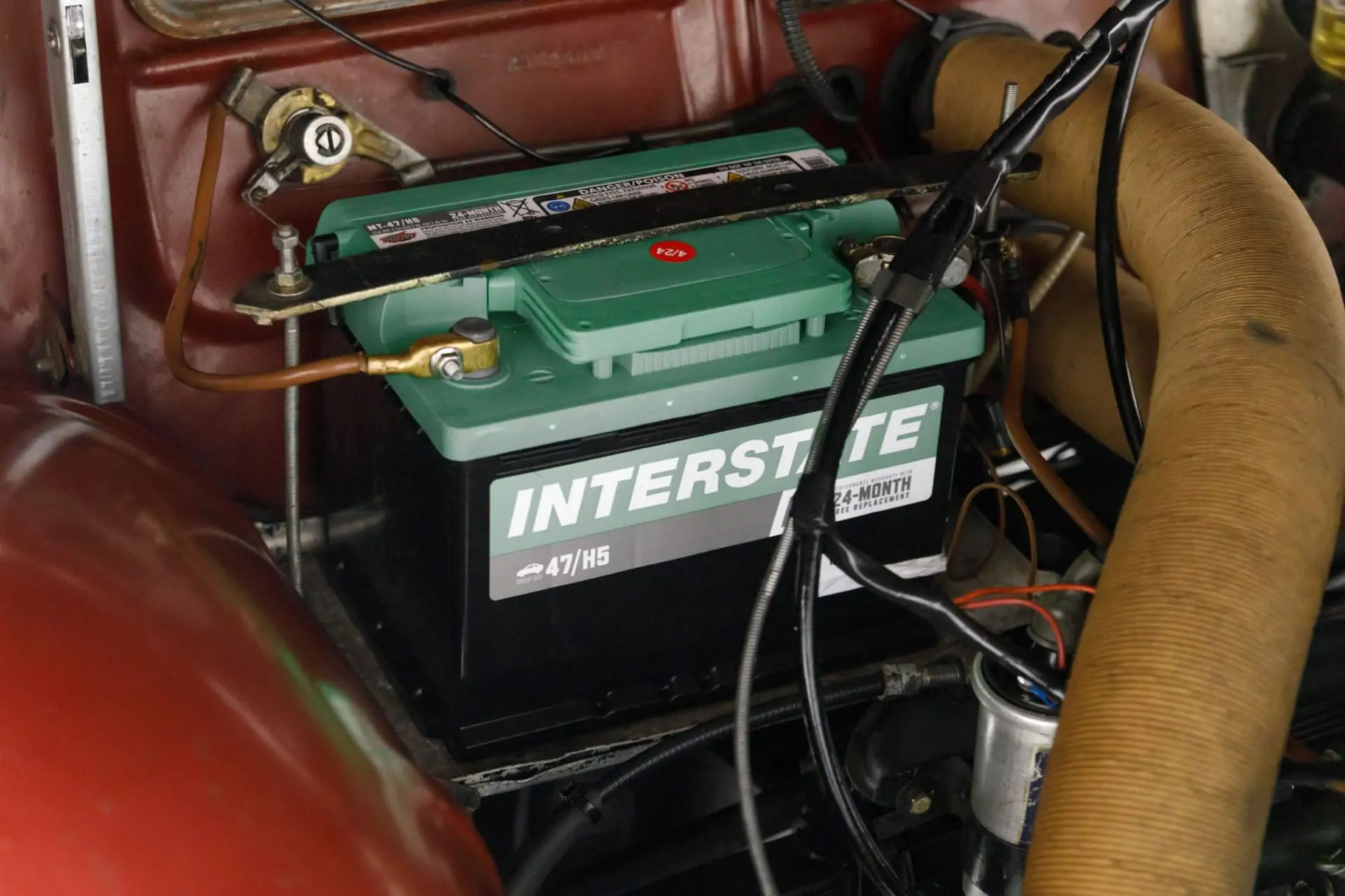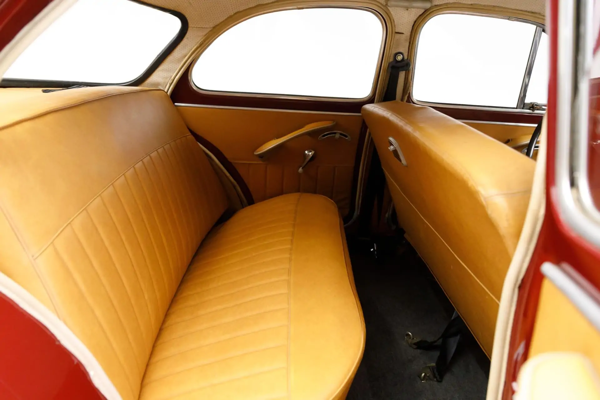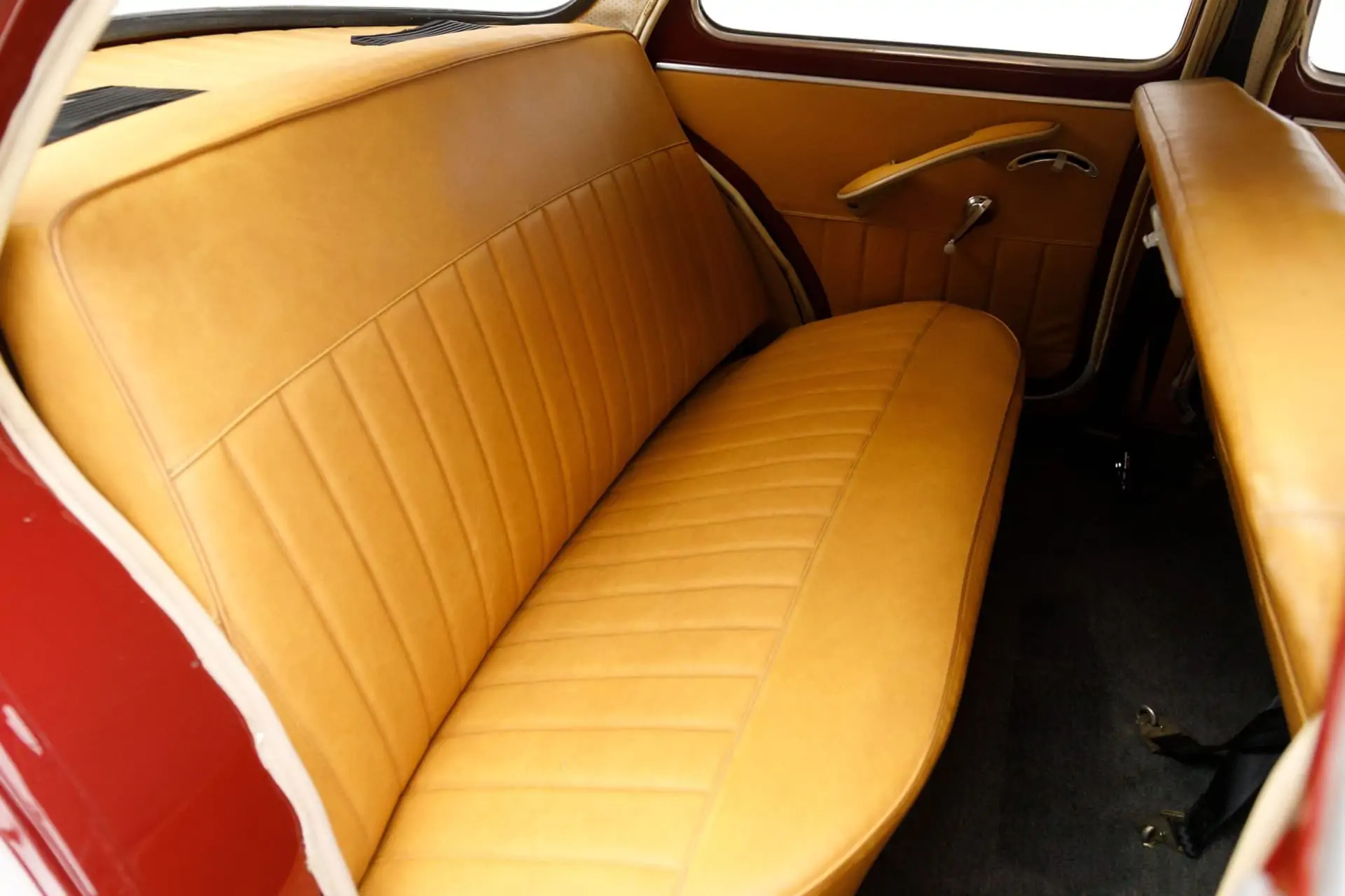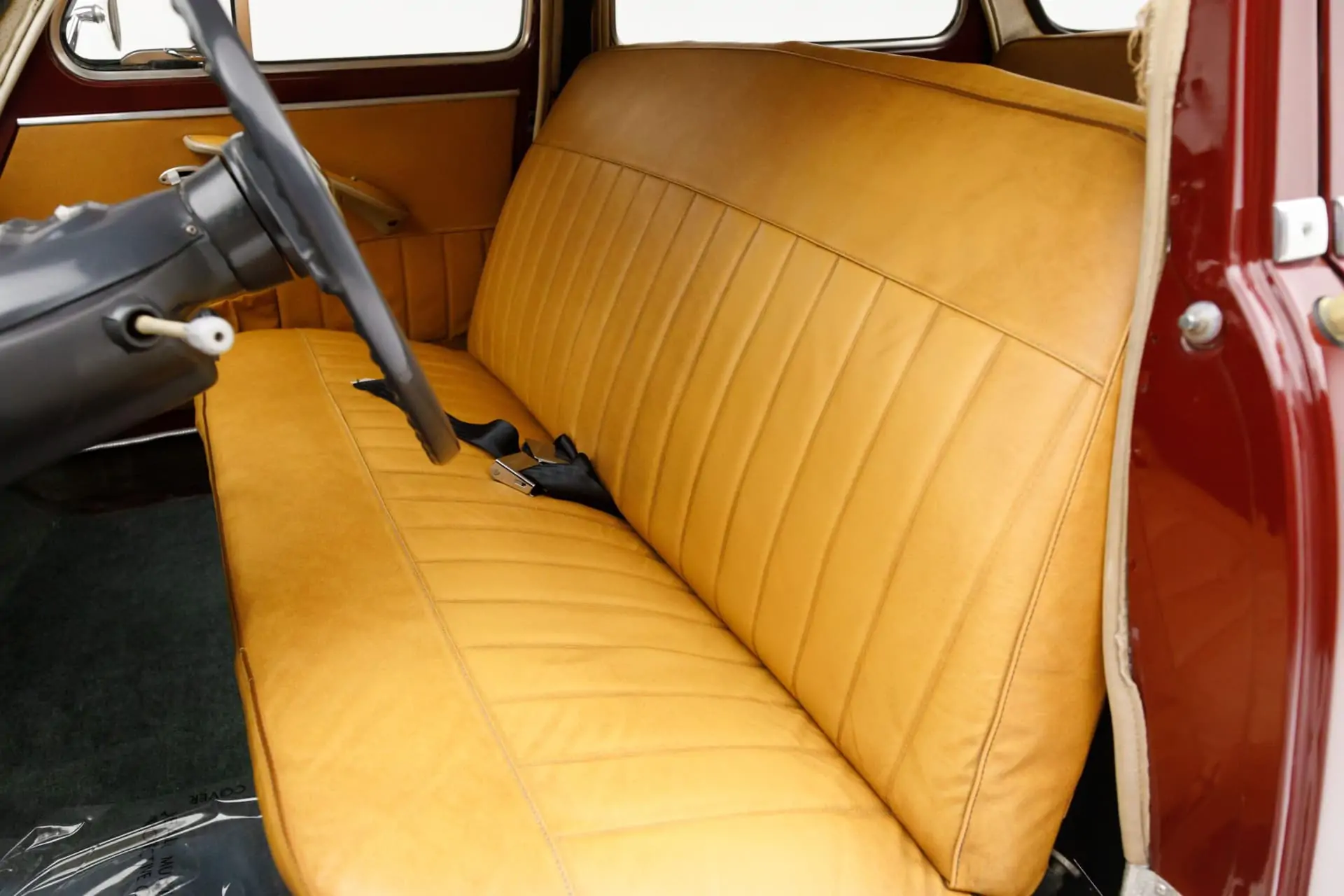 Les banquettes et les panneaux de porte sont garnis de vinyle beige, et le tableau de bord noir comporte une partie supérieure rembourrée et trois compartiments de rangement. Un seul levier actionne les clignotants, les phares et le klaxon, tandis que des interrupteurs situés sur la colonne de direction activent les essuie-glaces et les feux de stationnement de chaque côté de la voiture. Des ceintures de sécurité abdominales sont prévues pour les occupants avant, et des tapis noirs recouvrent les planchers et le coffre.