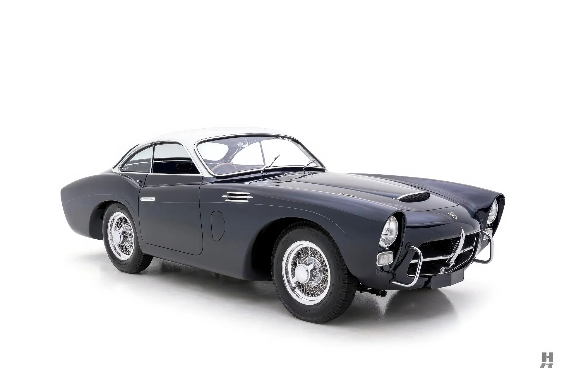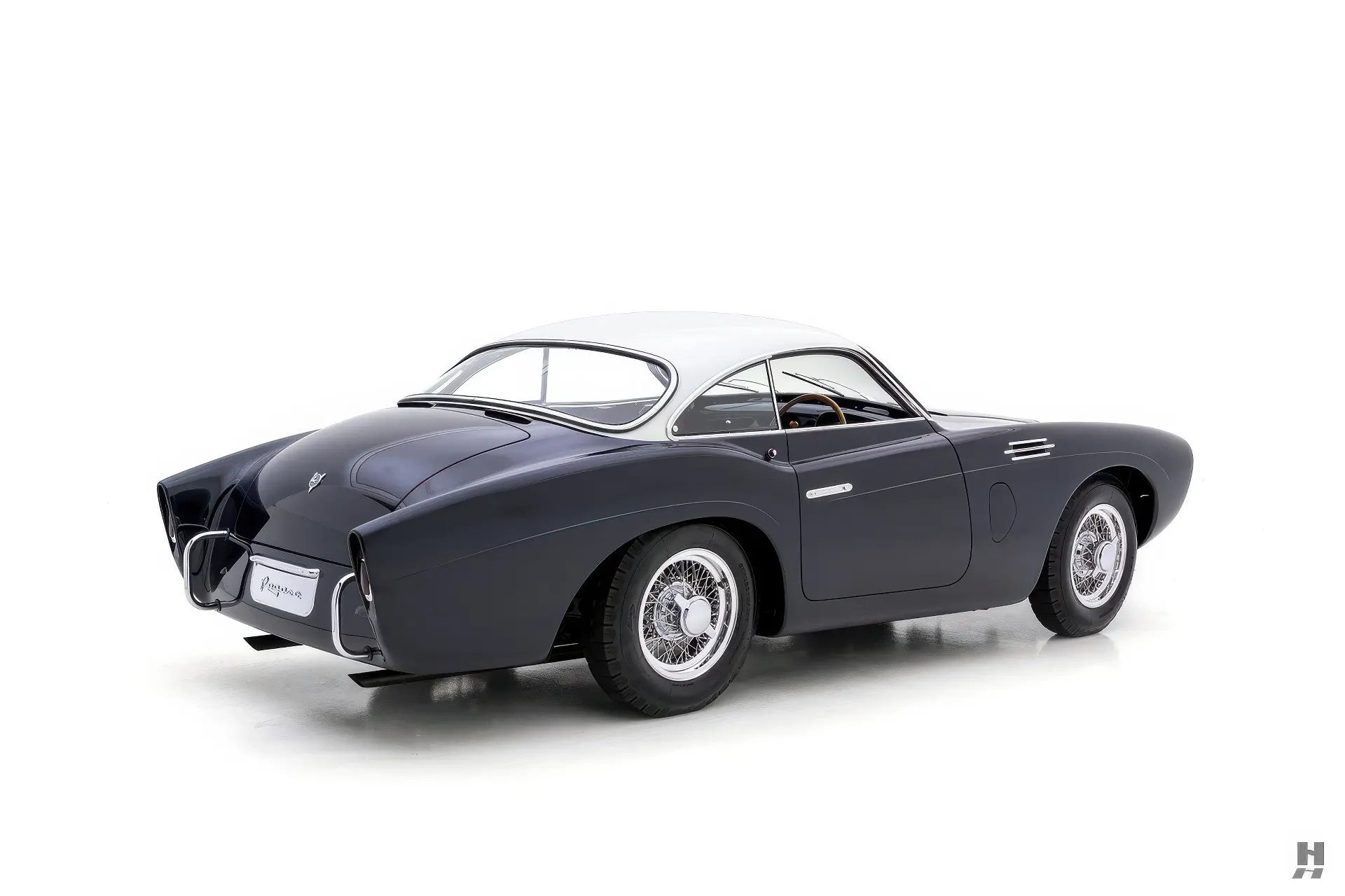 Parmi les exemples les plus audacieux de carrosseries de Pegaso figurent celles conçues par le célèbre carrossier parisien Saoutchik. La voiture proposée ici, l’une des sept Saoutchik Berlinetta série II construites sur le châssis Z-102, présente un style spectaculaire et unique. Chacune de ces voitures carrossées par Saoutchik a été individualisée avec de subtiles variations dans le design, mais elles partagent toutes une ligne de toit basse caractéristique et des ailes voluptueusement incurvées. Les arches avant s’étendent au-dessus des phares Marchal, mettant en valeur le profil élégant et puissant de la voiture, tandis que les arches arrière s’évasent pour souligner l’agressivité de la position.