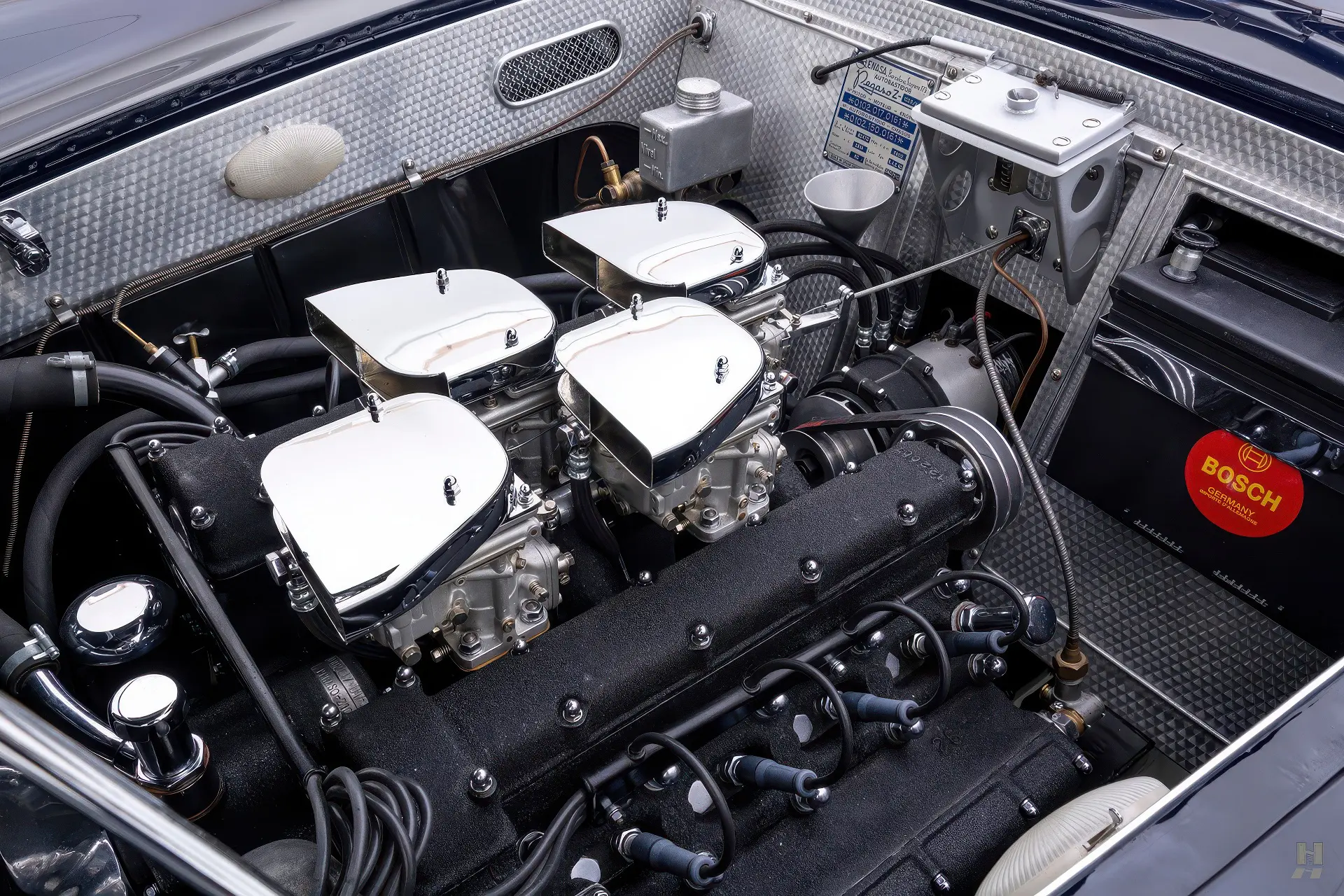 Le numéro de châssis 0102-150-0161 est un exemple de ce travail exceptionnel. Livrée avec une conduite à droite – bien que, curieusement, le « 150 » dans le numéro de châssis indique une configuration de conduite à gauche – la voiture était équipée de la très recherchée culasse à double allumage. Selon l’ouvrage de référence Ricart-Pegaso : La Pasión del Automóvil de Carlos Mosquera et Enrique Coma-Cros, son premier propriétaire fut Domecq de la Riva, que l’on pense être le grand aristocrate espagnol Don Pedro Domecq de la Riva.