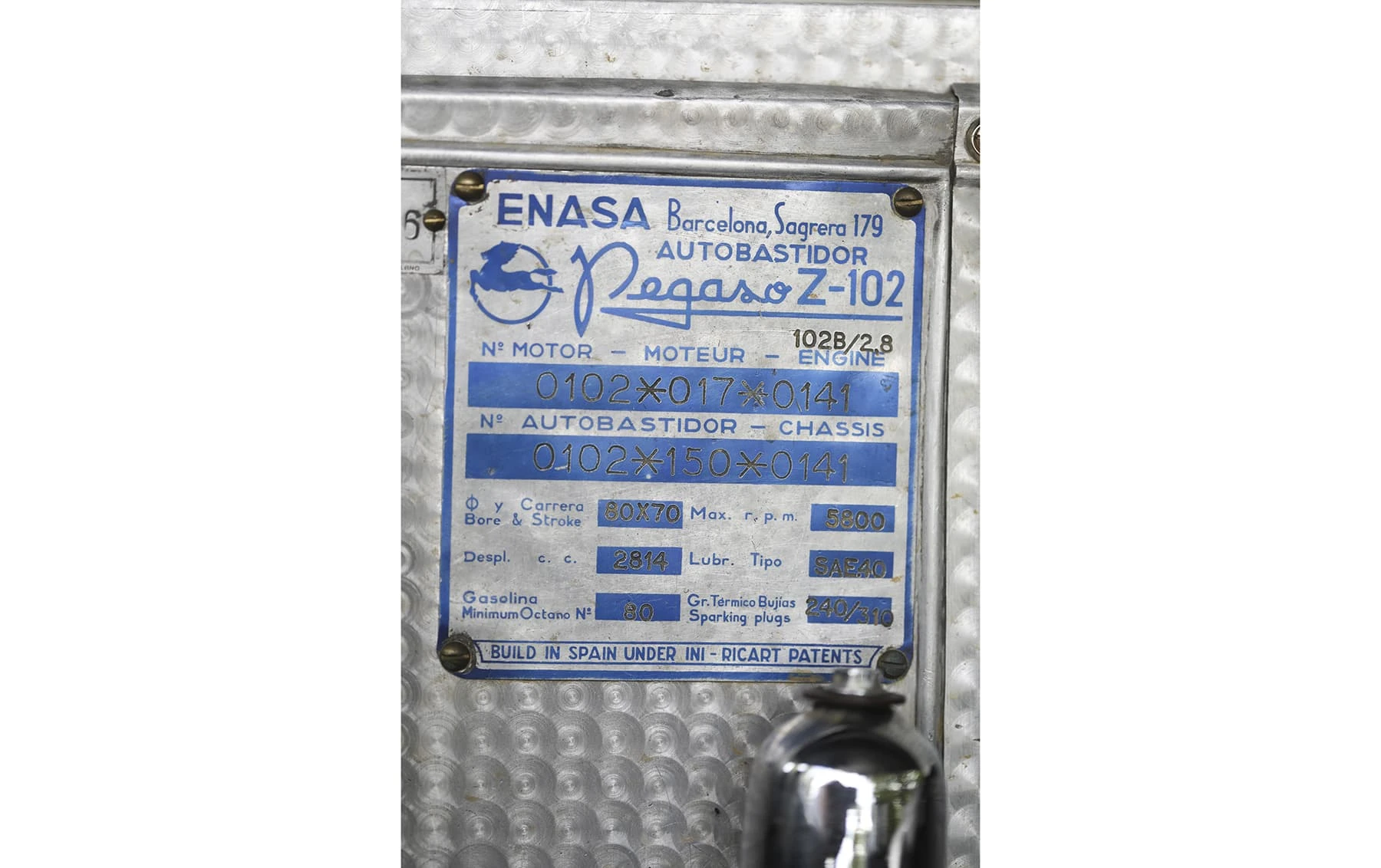 Née en tant que berlinette Touring de première série, cette Z-102 a été vendue neuve à Juan Jover, le premier pilote espagnol à courir en Formule 1, ainsi qu’un pilote de l’équipe de la Scuderia Pegaso. Après avoir été blessé lors d’un accident au volant d’une Z-102 Competition Spider aux 24 heures du Mans en 1953, Jover avait besoin d’une voiture avec conduite à droite et a donc fait transformer cette voiture par l’usine. En outre, cette Z-102 était le premier exemplaire à être équipé de deux carburateurs Weber à quatre barils. La première course de Jover avec cette voiture fut la course de côte de Rabassada à Barcelone en juin 1954, suivie de la Vuelta a Cataluña en mai 1955, comme le montrent les photos d’époque figurant dans le dossier complet de la voiture.