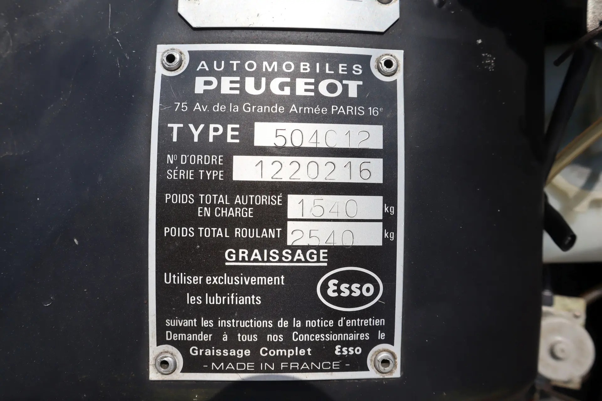 Ce coupé 504 à moteur 2L injection et boîte manuelle est tout simplement exceptionnel. Il a été acheté neuf le 28 janvier 1971 par un agent de cycles Peugeot de Haute-Savoie auprès du concessionnaire d’Annecy, ainsi qu’en témoignent le bon de commande et la facture d’achat d’origine. Commandée de couleur » Blanc Arosa » avec intérieur en drap marron, elle est restée entre les mains de son premier propriétaire jusqu’en 2012 ! Le dossier d’entretien de la voiture permet de suivre l’évolution de son kilométrage jusqu’aux 29 264 km affichés au compteur lors de notre examen, corroborés par l’état du véhicule. Très saine, avec un bon alignement des ouvrants, et des soubassements dans un état rare, la carrosserie a été repeinte dans sa teinte d’origine, tandis que la sellerie a été conservée d’origine. On note au passage le beau tableau de bord à compteurs ronds qui disparaîtra sur les versions ultérieures. Chaussé de pneus Michelin de 2017 dans un état proche du neuf, ce superbe coupé est accompagné de son barré rouge d’origine, de son manuel d’entretien et de conduite, et de son carnet d’entretien. Comme toute voiture préservée avec soin, on trouve même la boîte d’ampoules spécifique au modèle dans la boîte à gants et la façade retirée pour y placer un autoradio cassette Philips. Il s’agit assurément d’un des plus beaux exemplaires d’origine présents sur le marché.