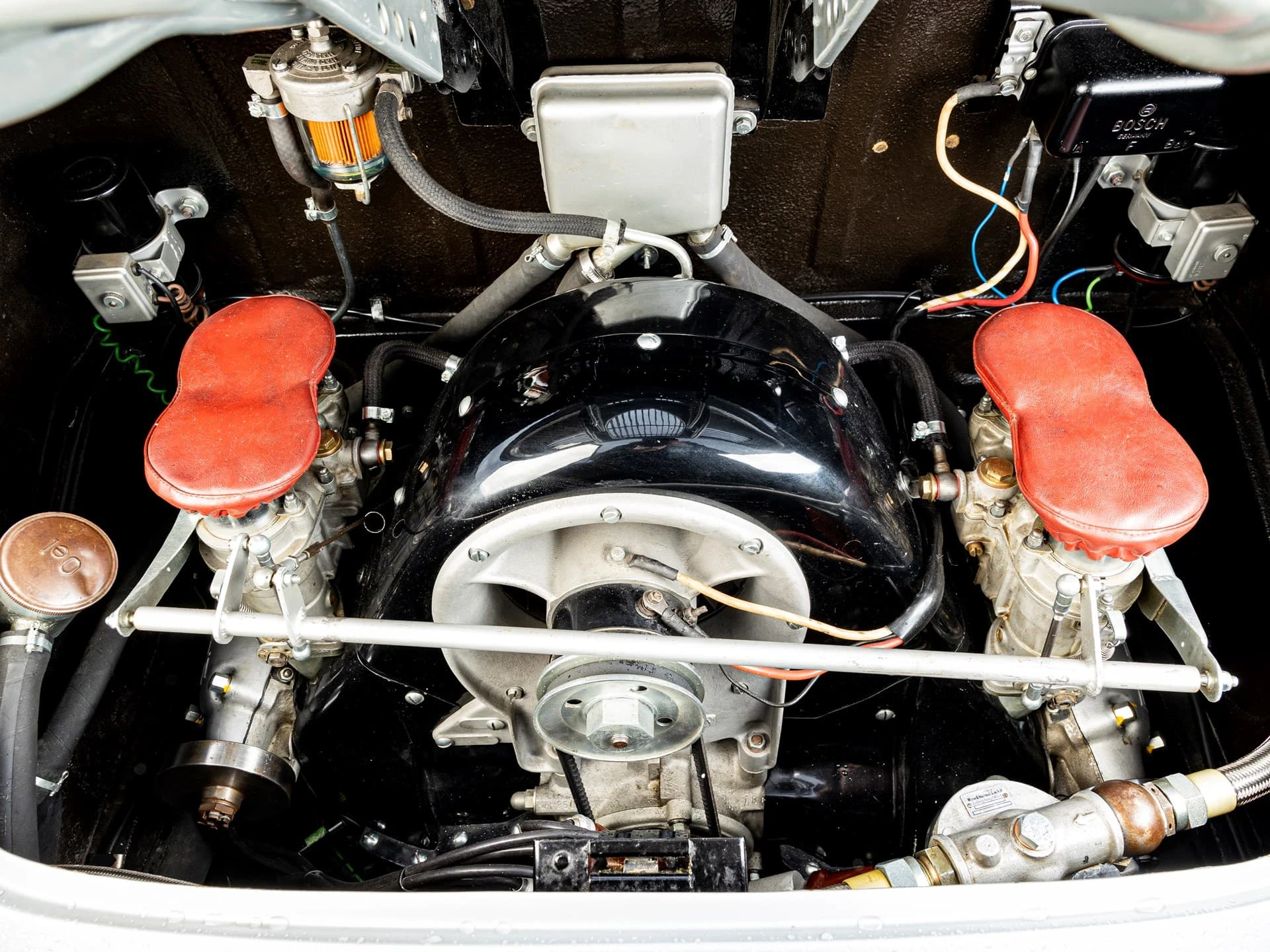 Le moteur Porsche à « quatre cames », comme on l’appelle aujourd’hui, est apparu pour la première fois sur les 550 Spyder à moteur central de la société au début des années 1950. Développant environ 110 chevaux à 6 200 tr/min en configuration de course, soit environ le double de la puissance des moteurs à poussoirs de taille similaire de la société, cet intrigant moteur de 1,5 litre allait s’attaquer aux pénibles courses routières Carrera Panamericana de 1953, 1954 et 1955.