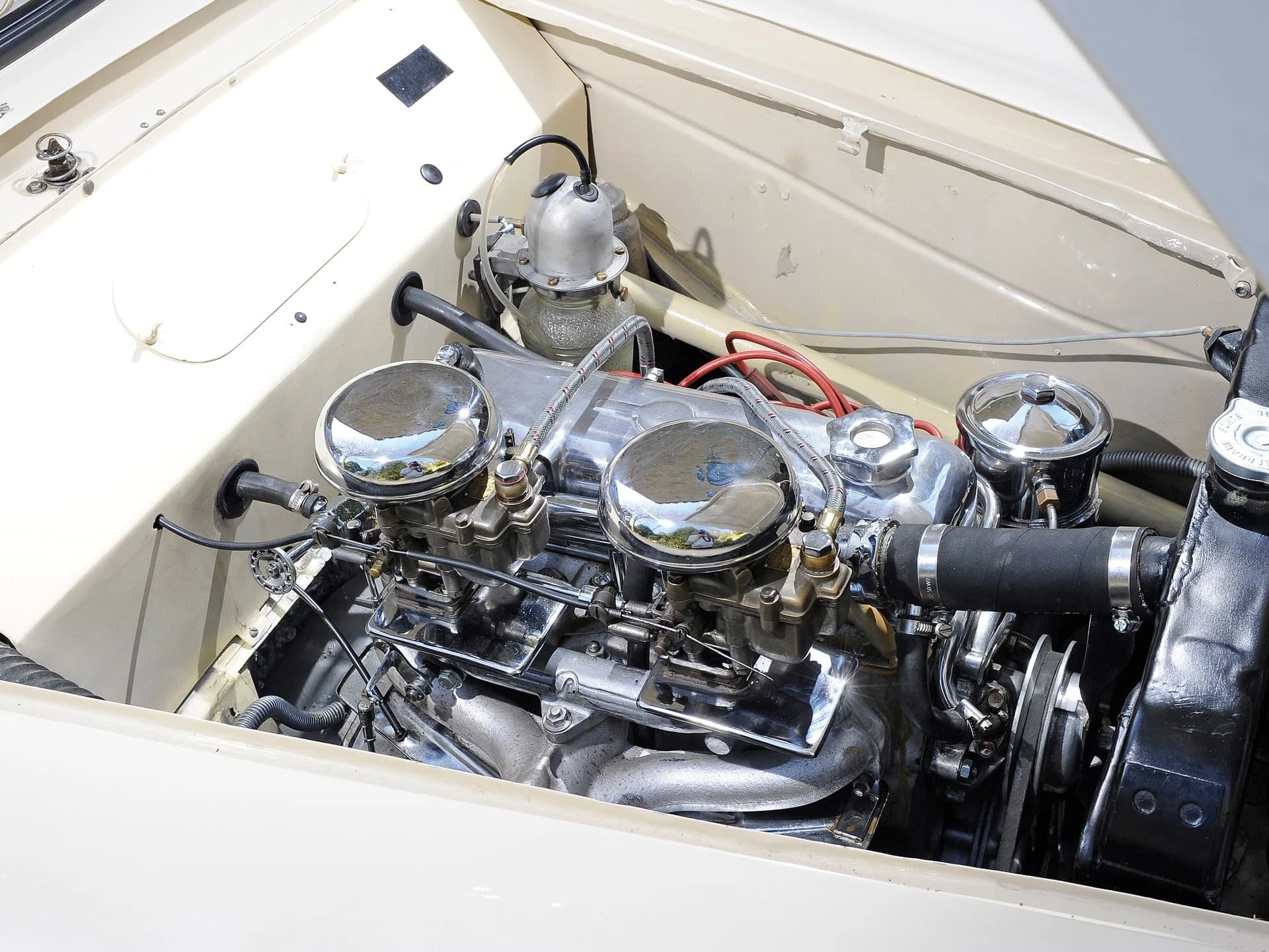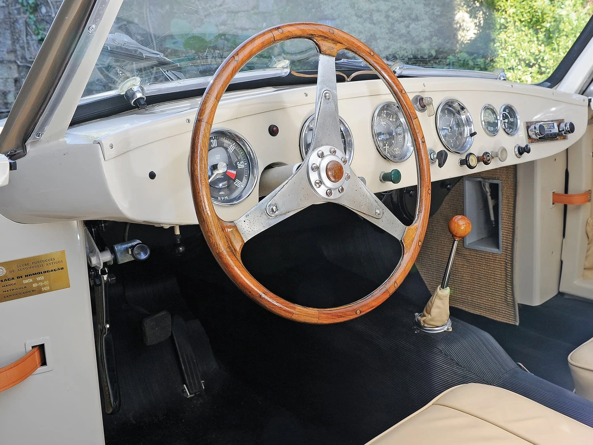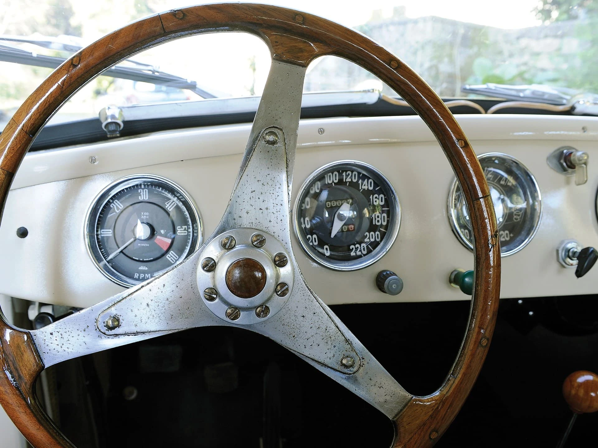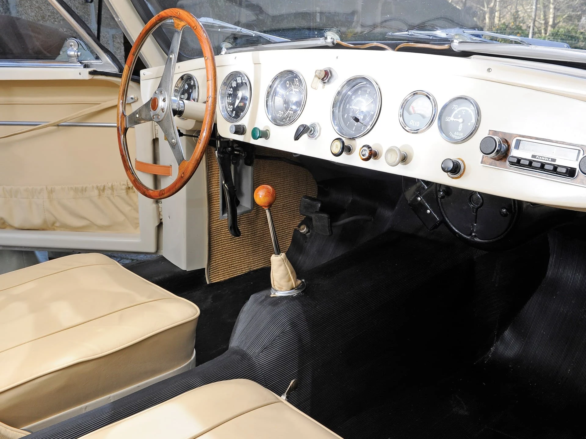 N’ayant eu qu’un seul propriétaire depuis sa création, cet exemplaire bénéficie d’un entretien adéquat et d’une restauration récente. Il conserve le moteur d’origine de 1 817 cc et est vraiment resplendissant dans sa finition extérieure bicolore, complétée par des jantes à rayons métalliques, un intérieur restauré avec une moquette à tissage carré et des équipements comprenant un bouchon de réservoir d’essence à dégagement rapide de type course, une instrumentation complète et une radio AM à semi-conducteurs Pianola. Inscrite au registre italien des voitures, accompagnée d’une brochure couleur d’usine et joliment présentée, cette Siata Daina Coupé est tout simplement un merveilleux exemple, avec son châssis et sa mécanique issus de la compétition, et sa remarquable carrosserie en aluminium signée Bertone.