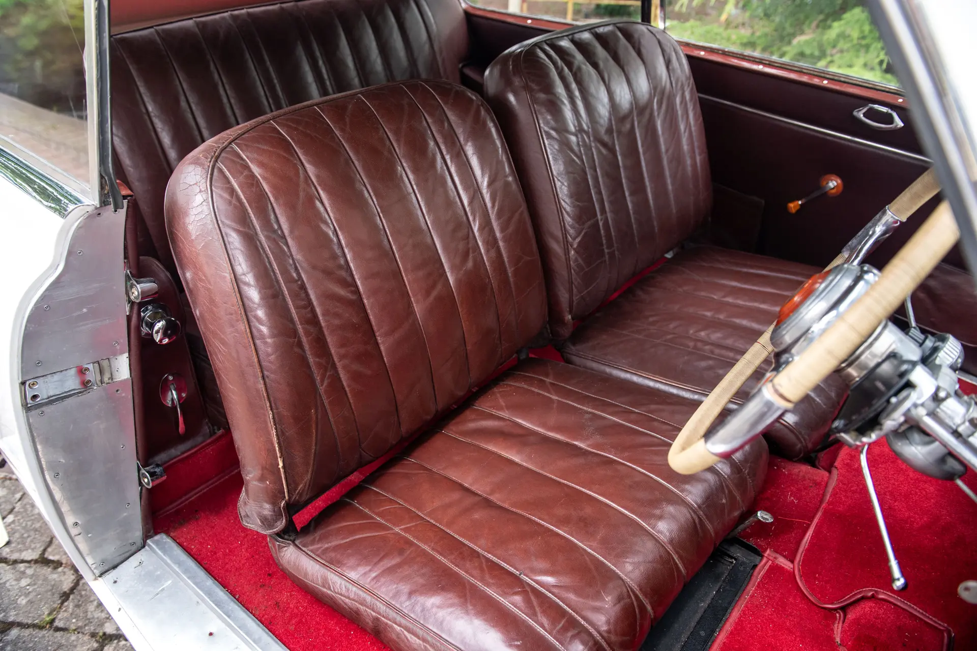 La voiture est immatriculée à Paris en 1979, et c’est en 1985 que son actuel propriétaire en fait l’acquisition lors d’une vente aux enchères au musée de l’Automobile de Reims. L’élégant coach est alors en état d’origine, superbement préservé, et n’a que peu roulé depuis l’origine. Il a depuis été repeint en blanc, la sellerie d’origine a été conservée et les moquettes refaites. Le moteur est celui d’origine et nous avons pu constater son bon fonctionnement, tout comme celui de la boîte Wilson. Les 41 839km au compteur correspondent très vraisemblablement au kilométrage d’origine.