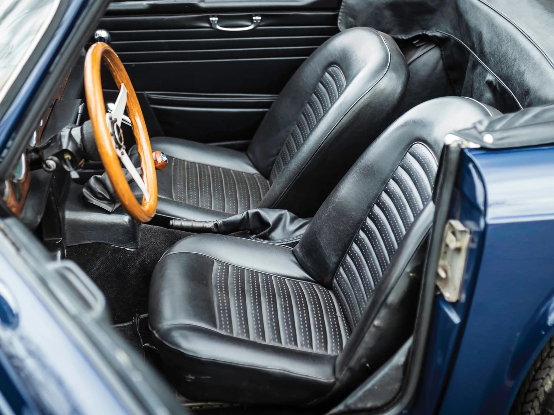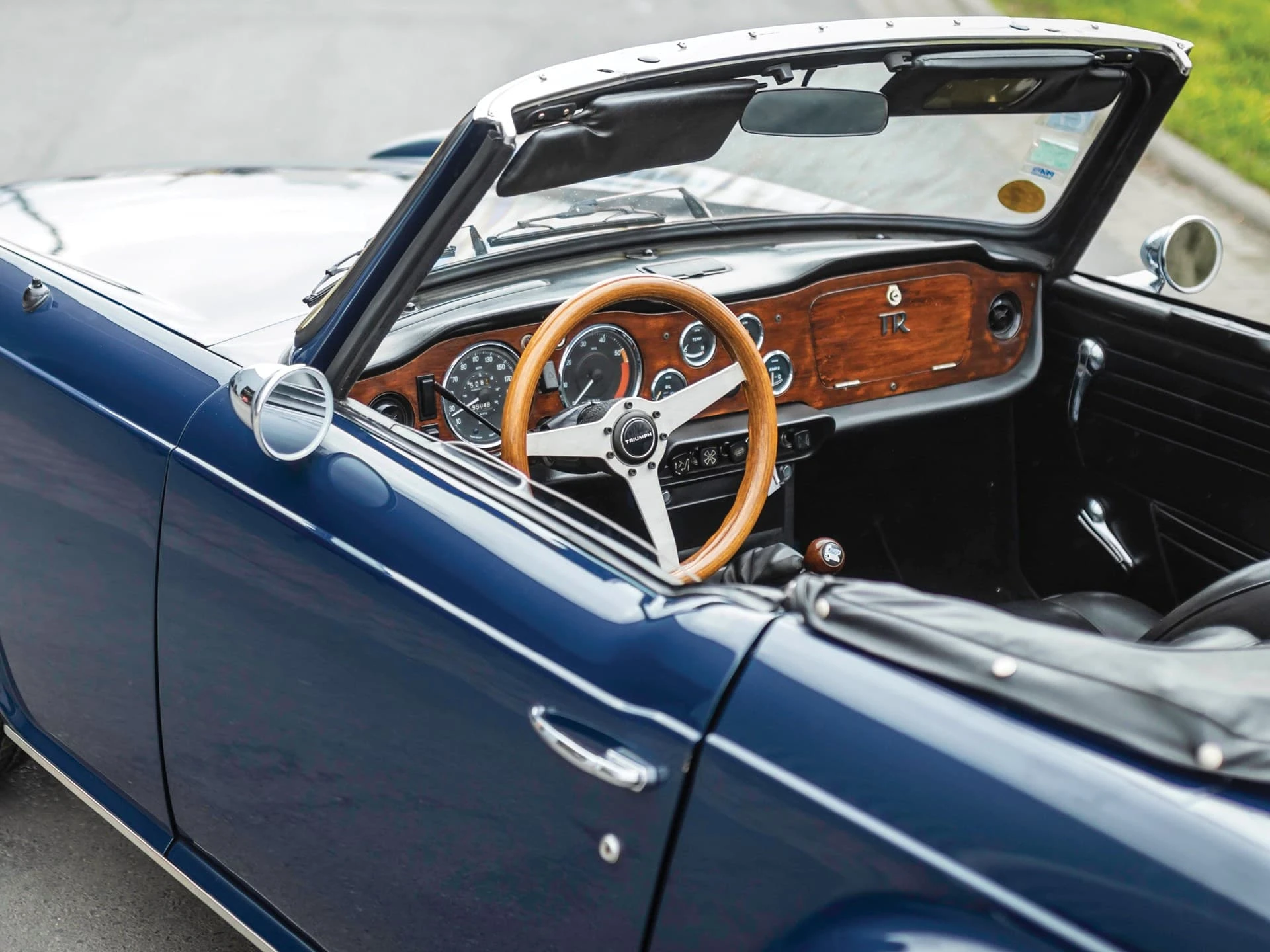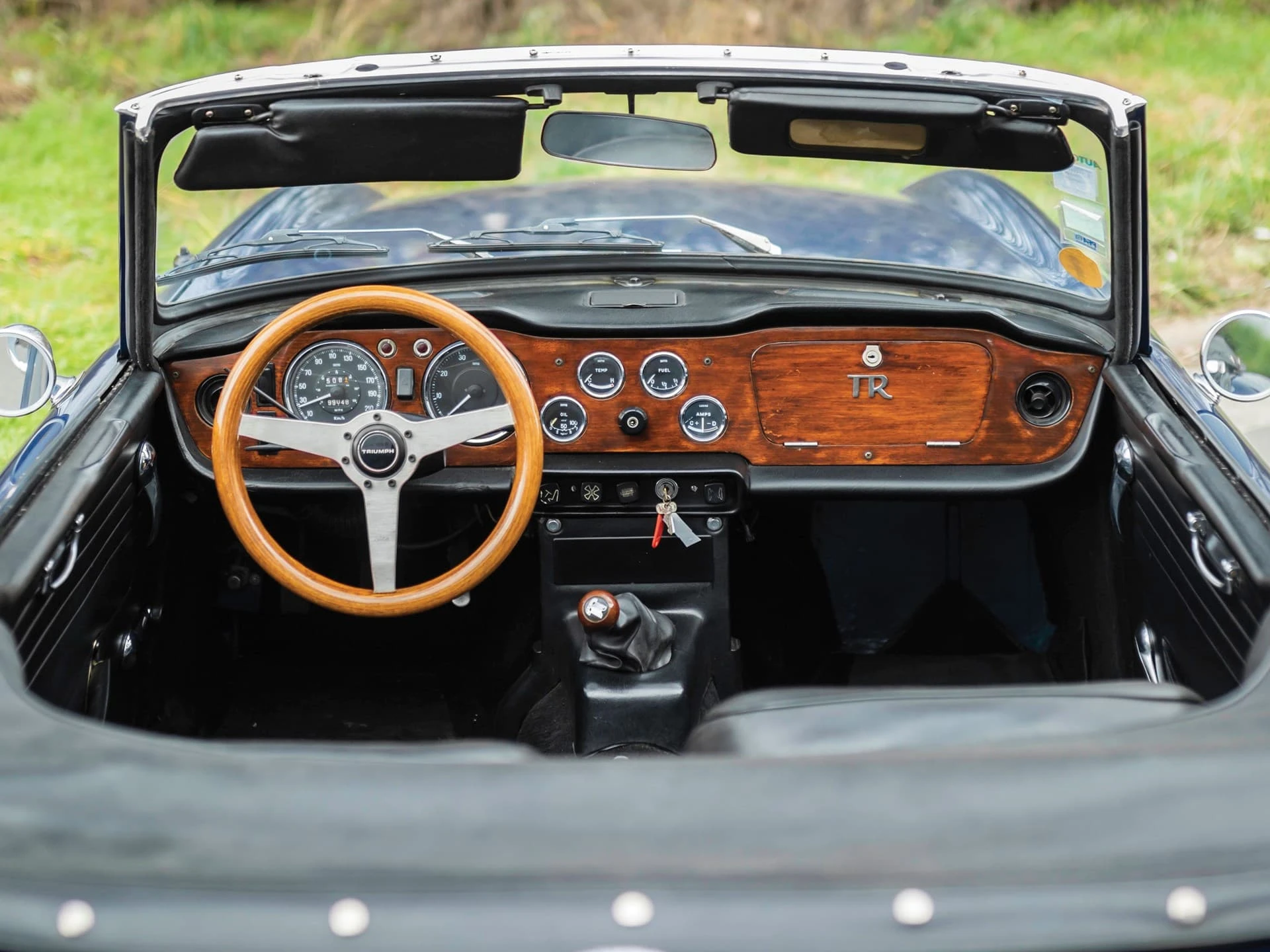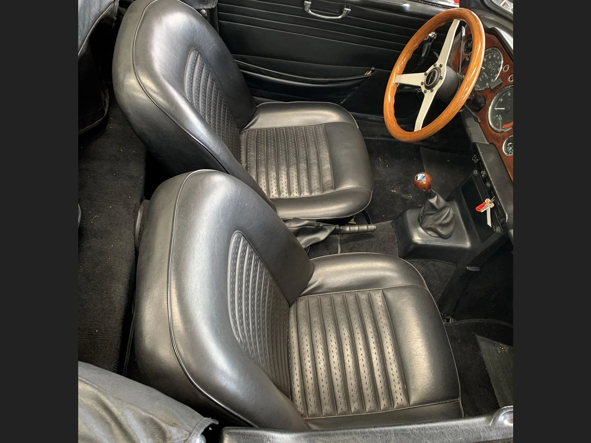 La construction des triumph TR6 se faisait toujours à l’ancienne, la carrosserie était boulonnée au châssis, loin de la technique monocoque qui prévalait à l’époque. La planche de bord était en bois veiné.