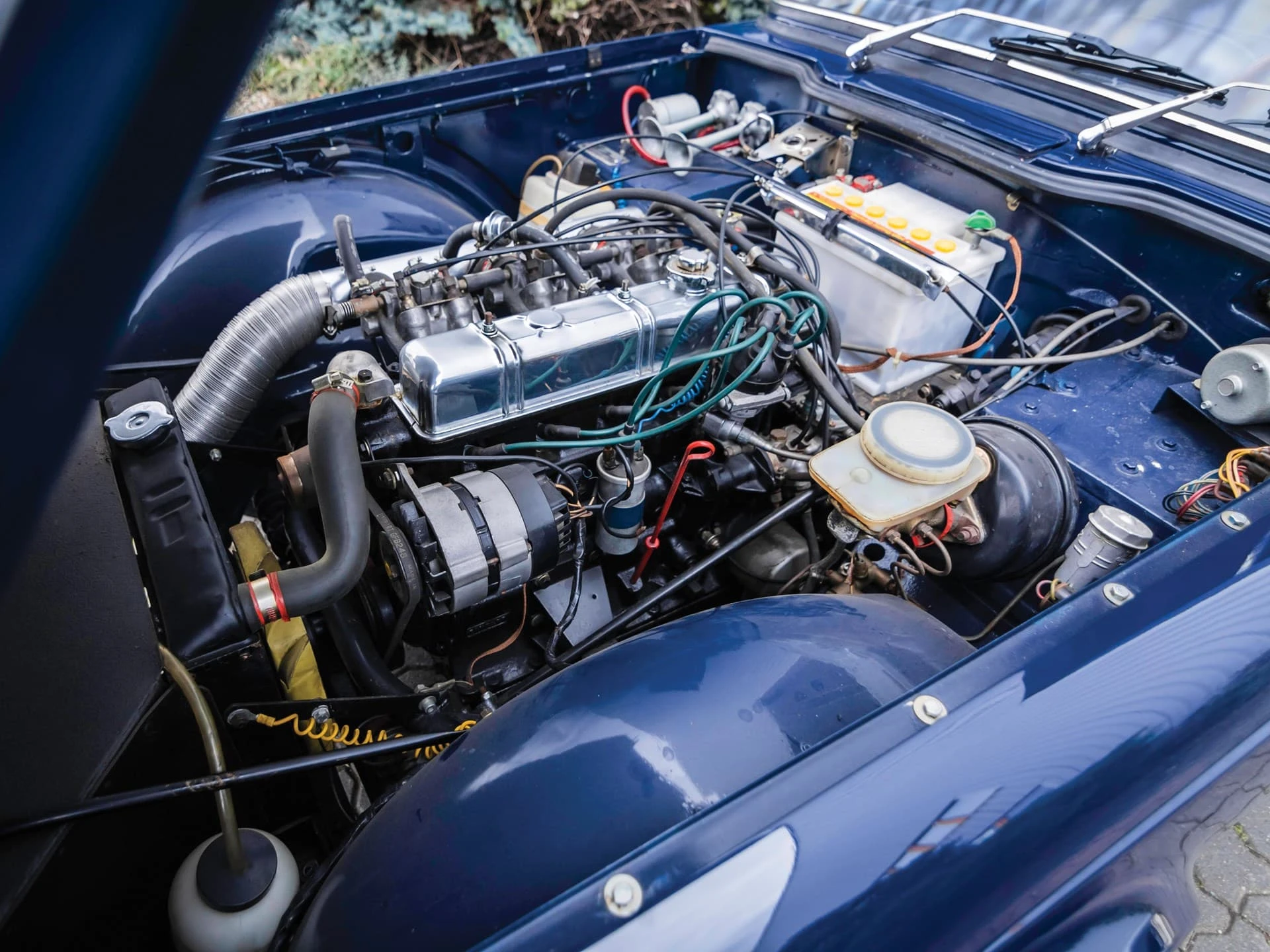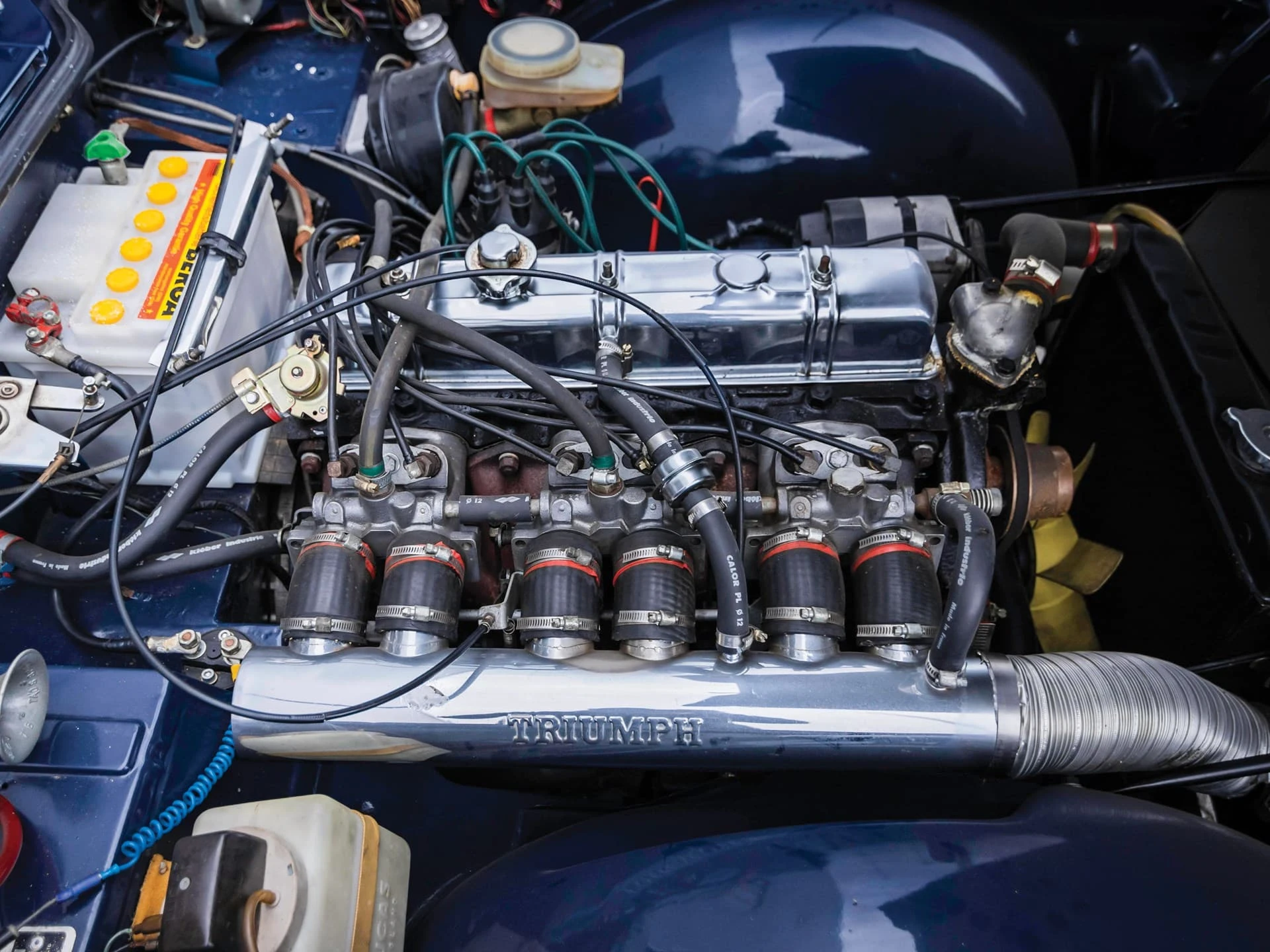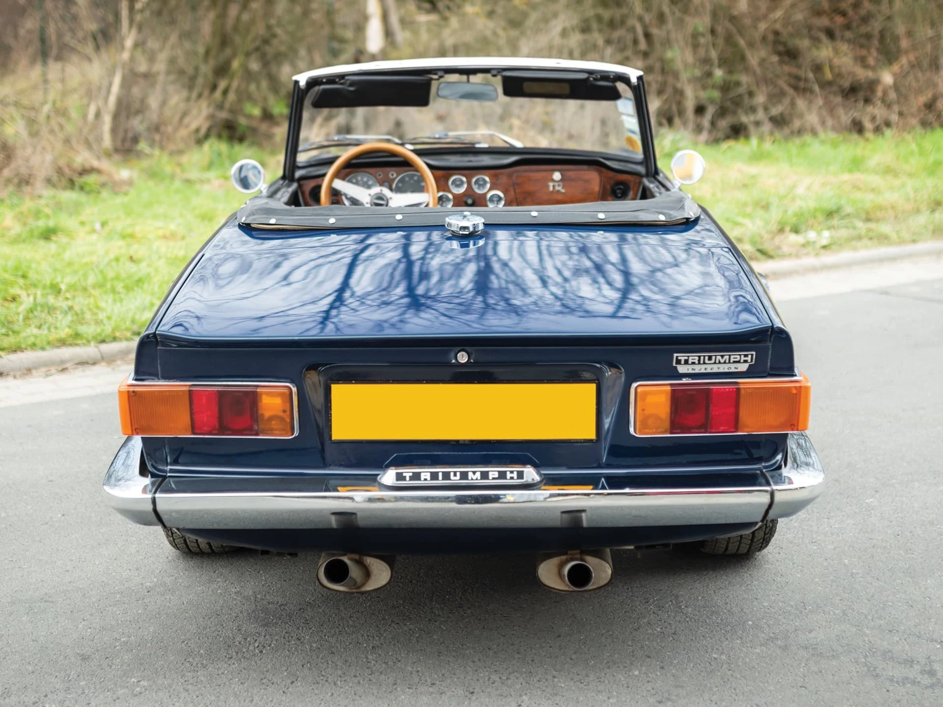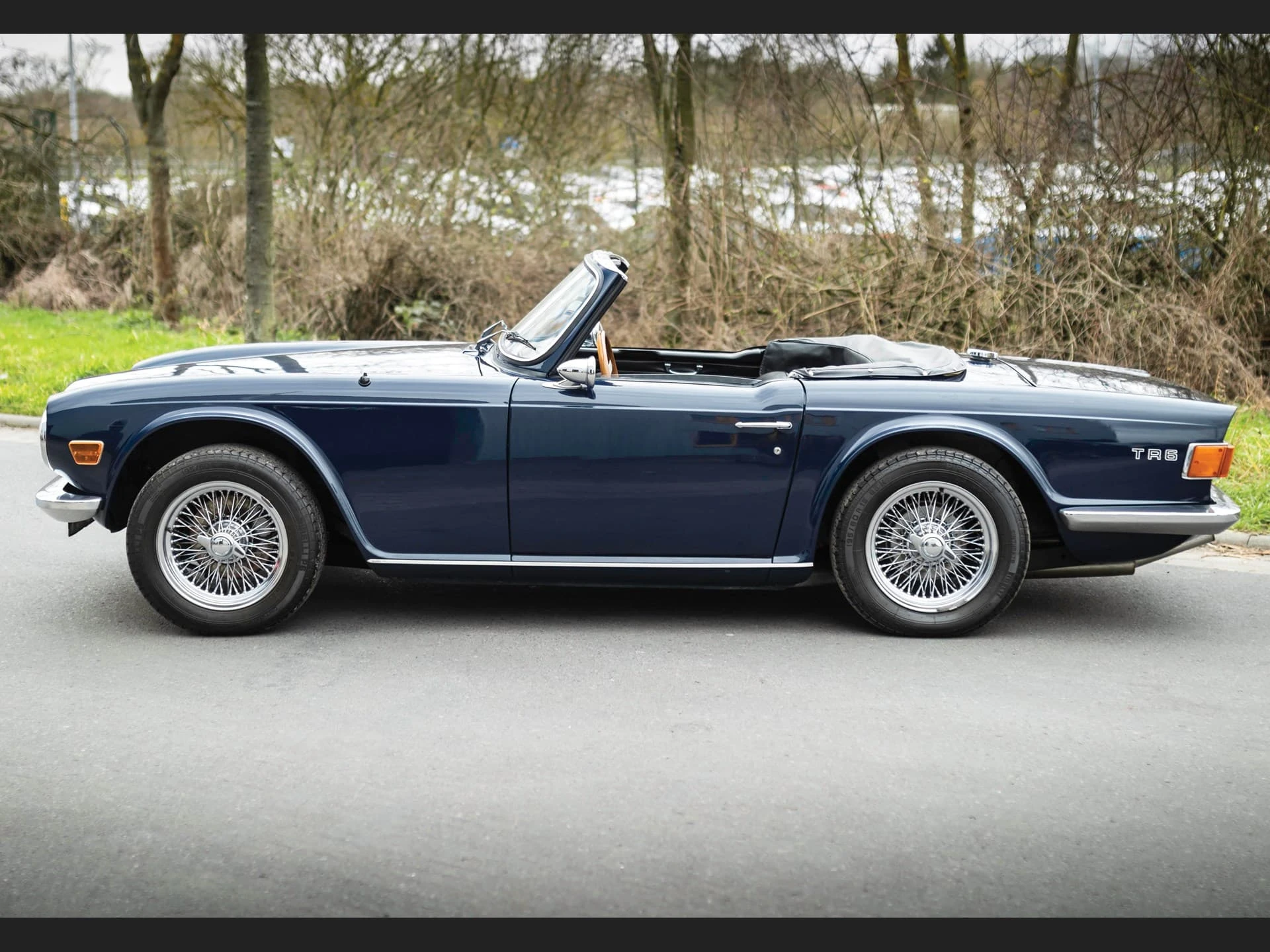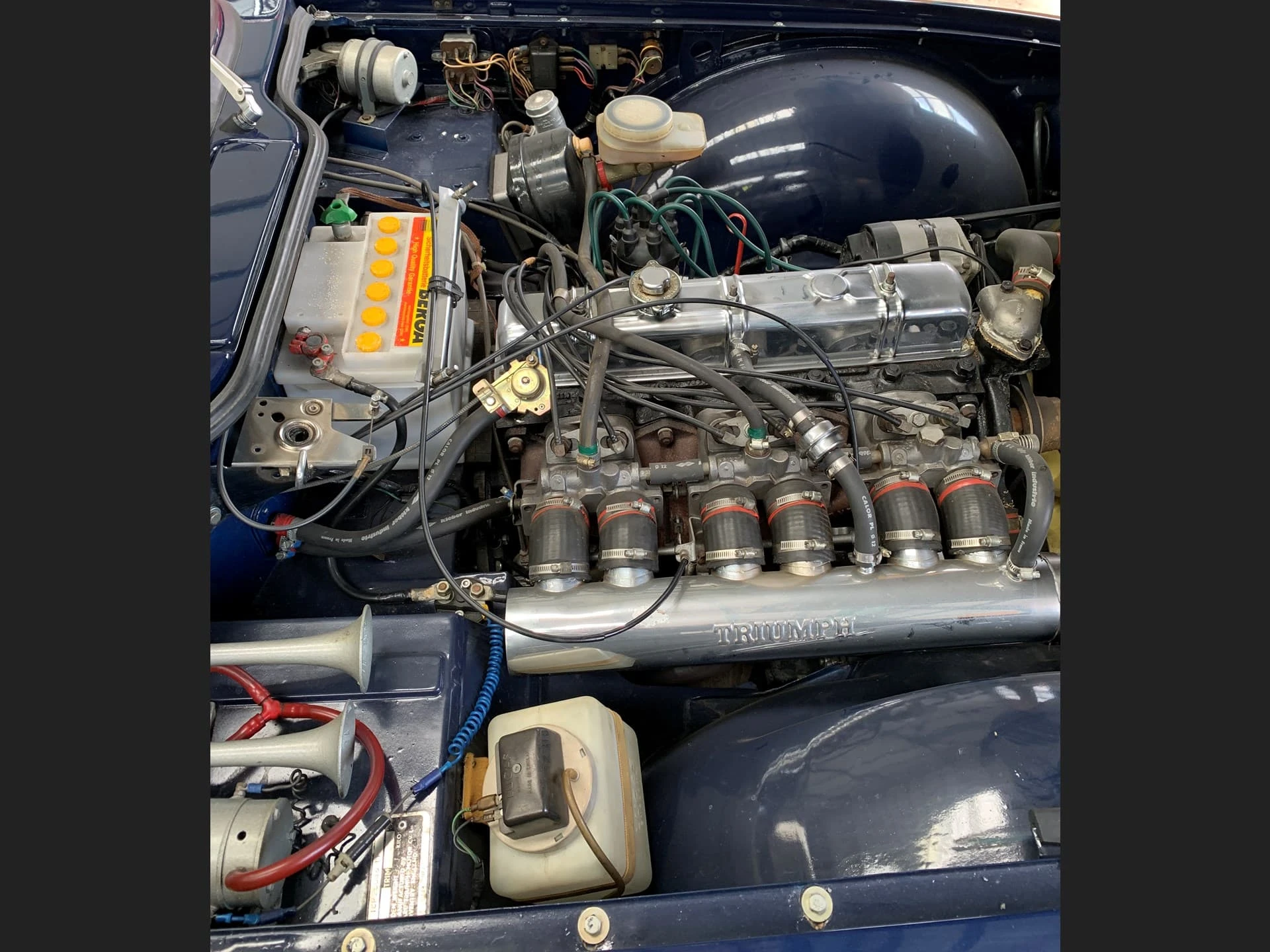 La construction des triumph TR6 se faisait toujours à l’ancienne, la carrosserie était boulonnée au châssis, loin de la technique monocoque qui prévalait à l’époque. La planche de bord était en bois veiné.