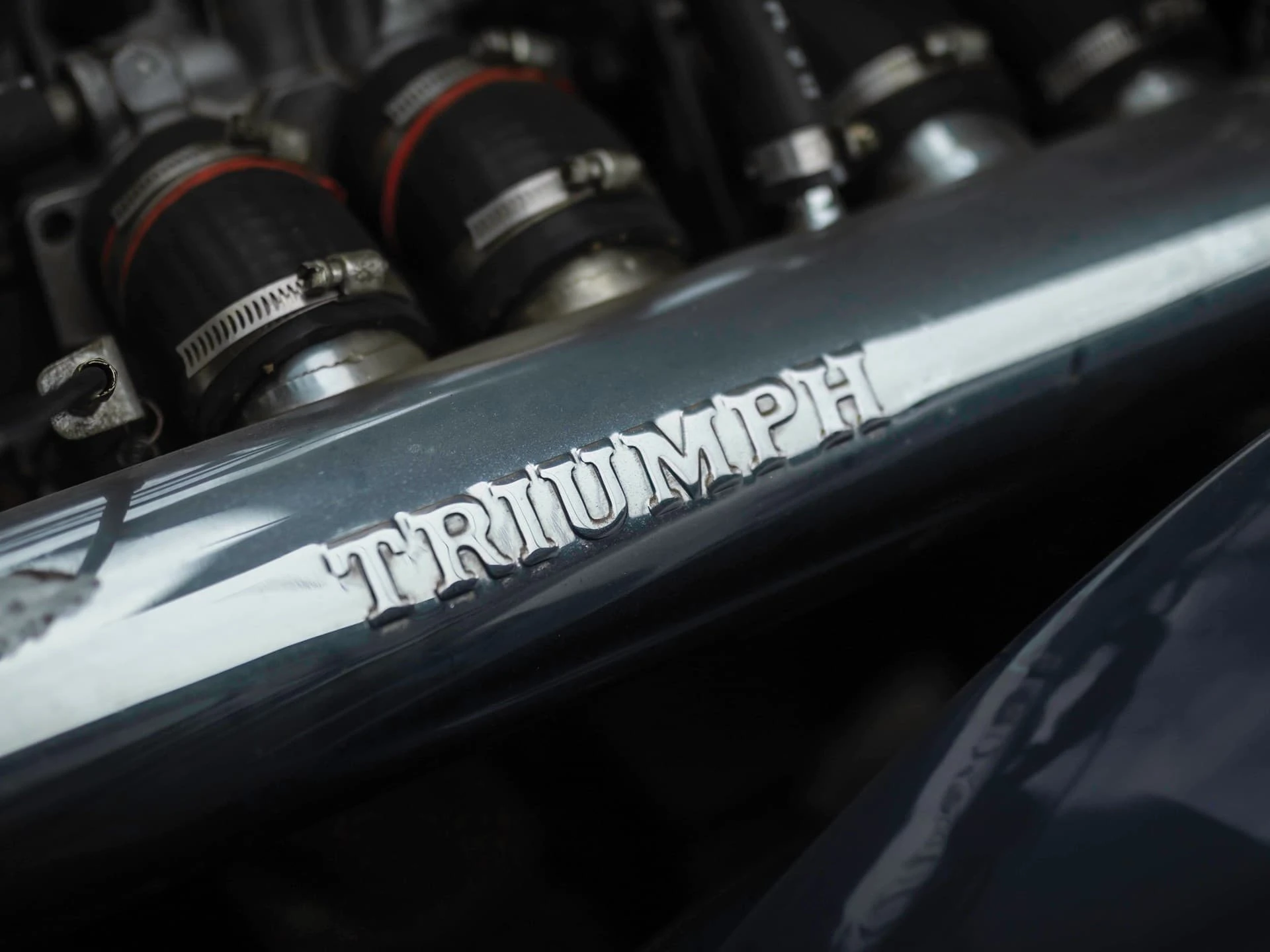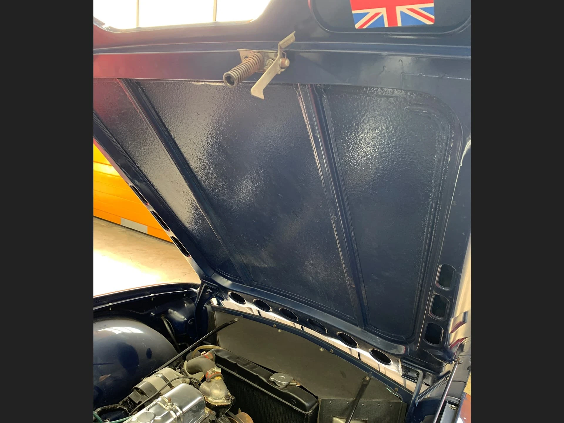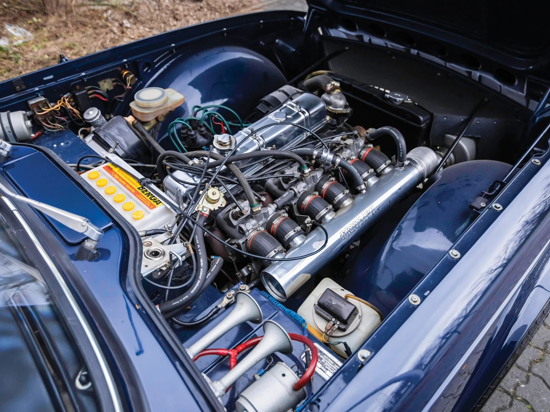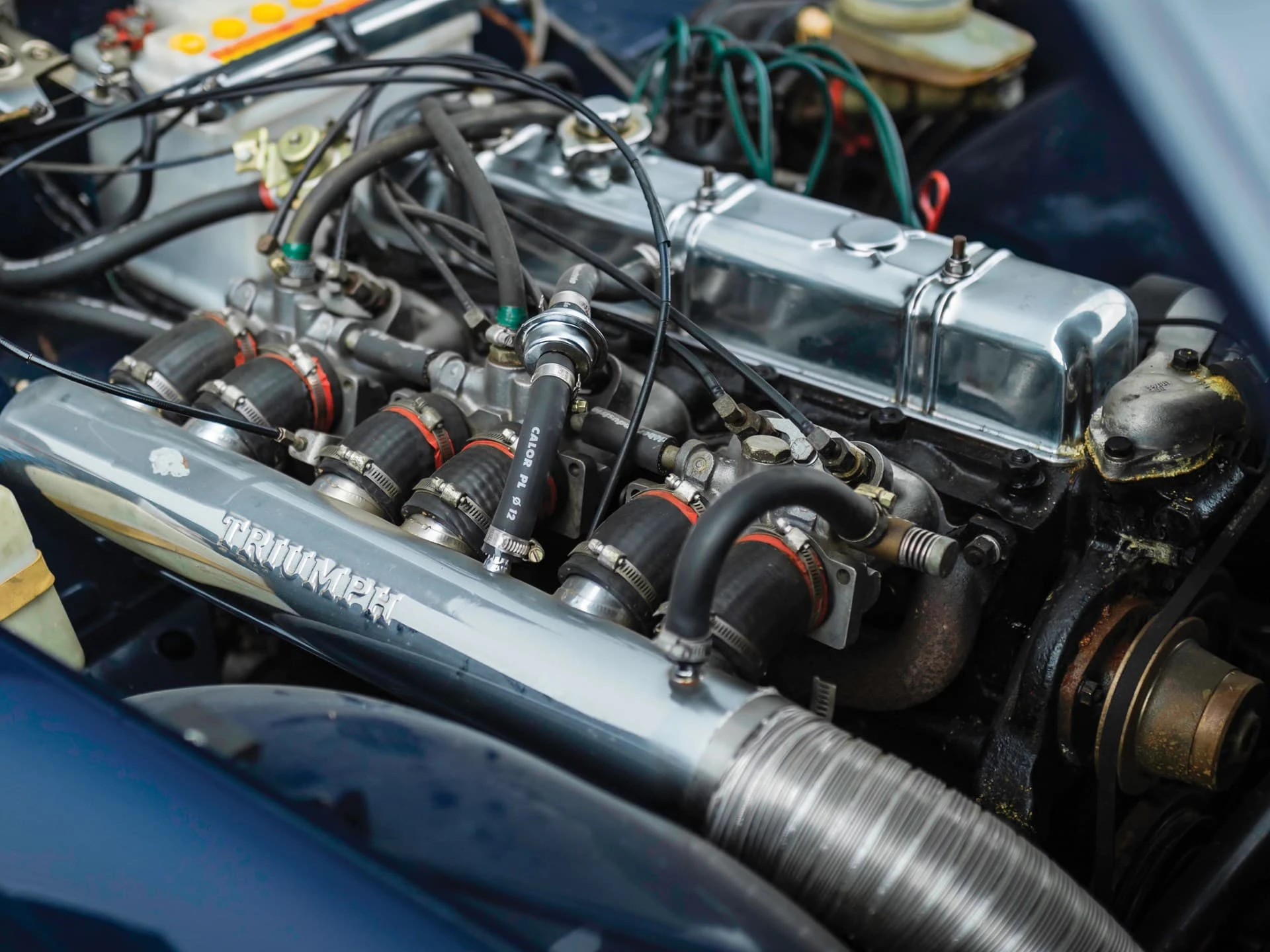 La construction des triumph TR6 se faisait toujours à l’ancienne, la carrosserie était boulonnée au châssis, loin de la technique monocoque qui prévalait à l’époque. La planche de bord était en bois veiné.