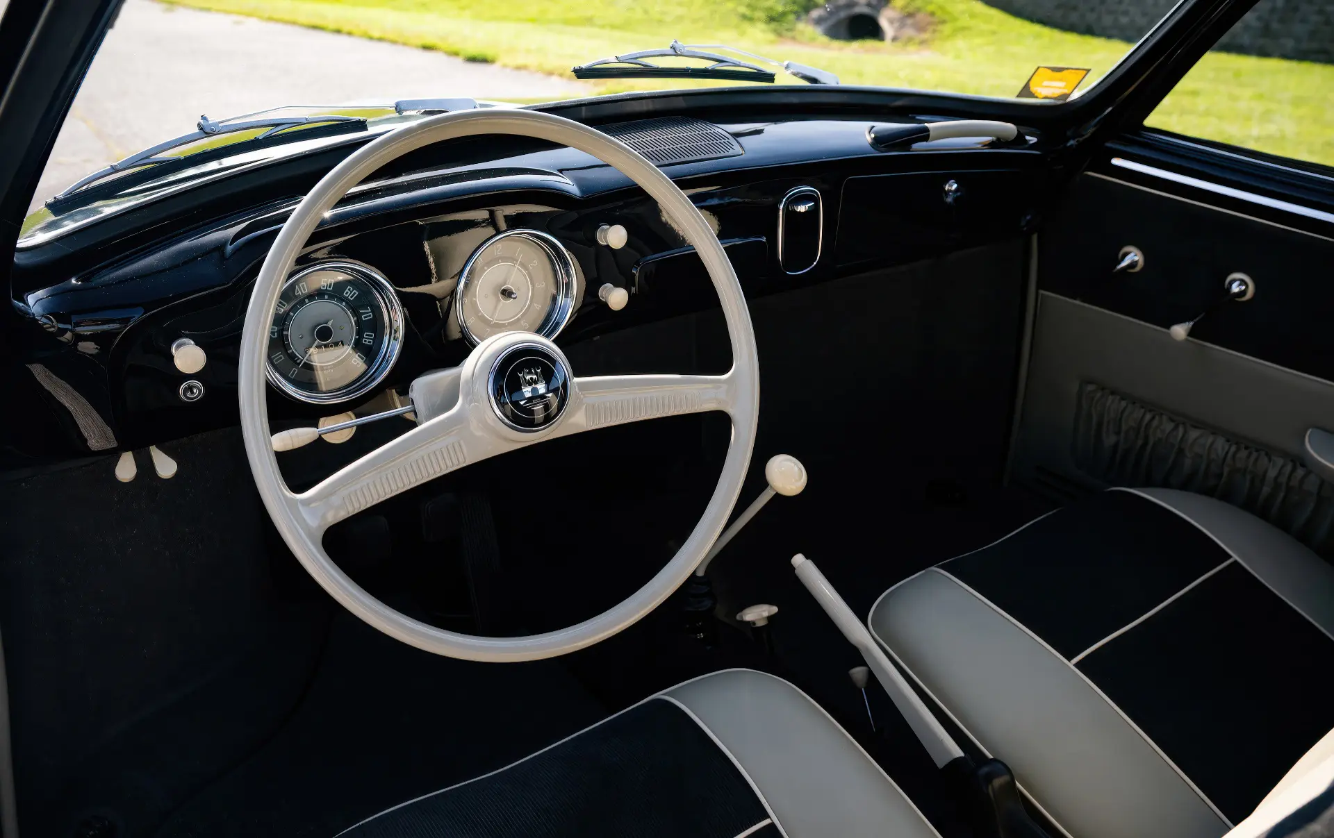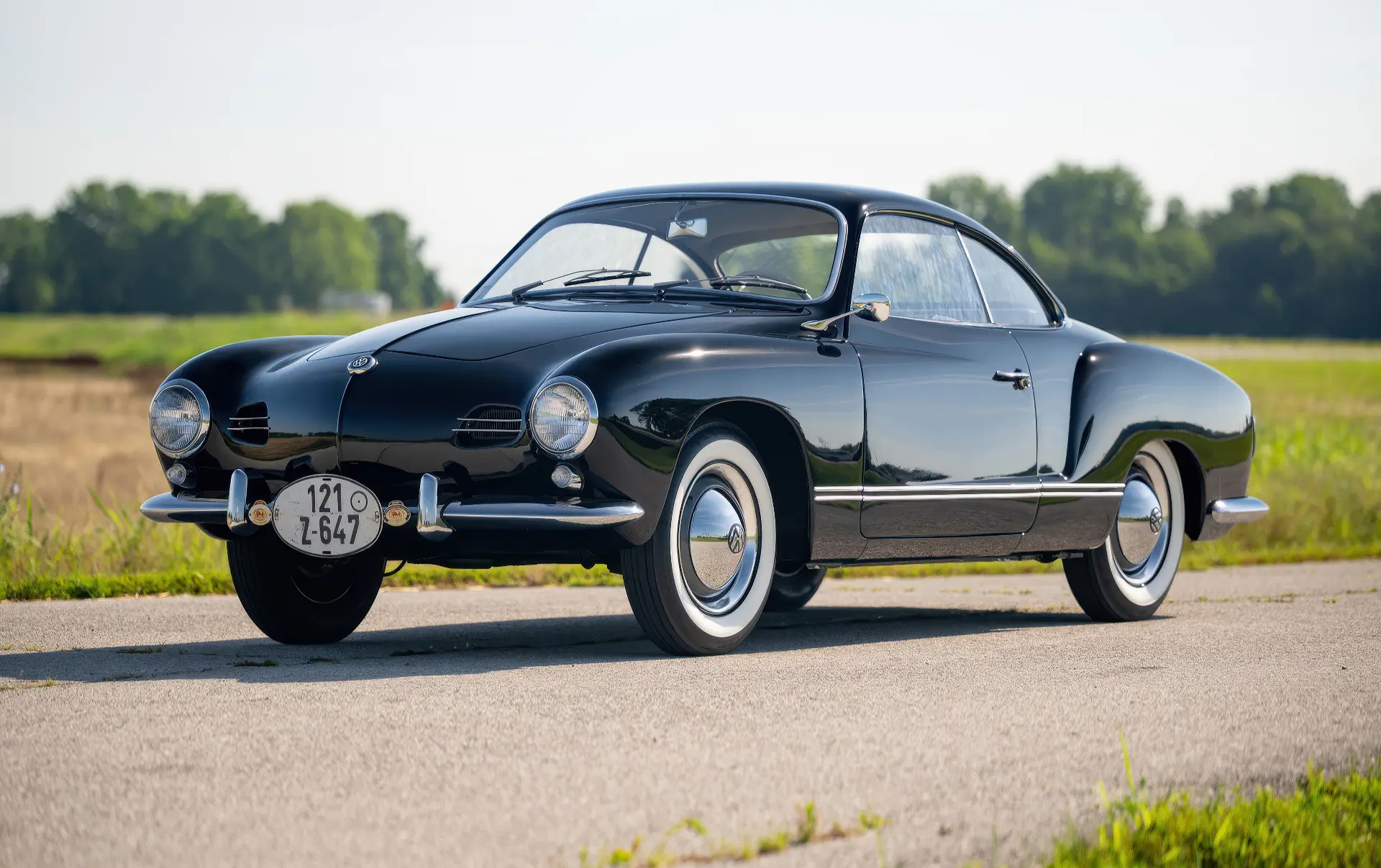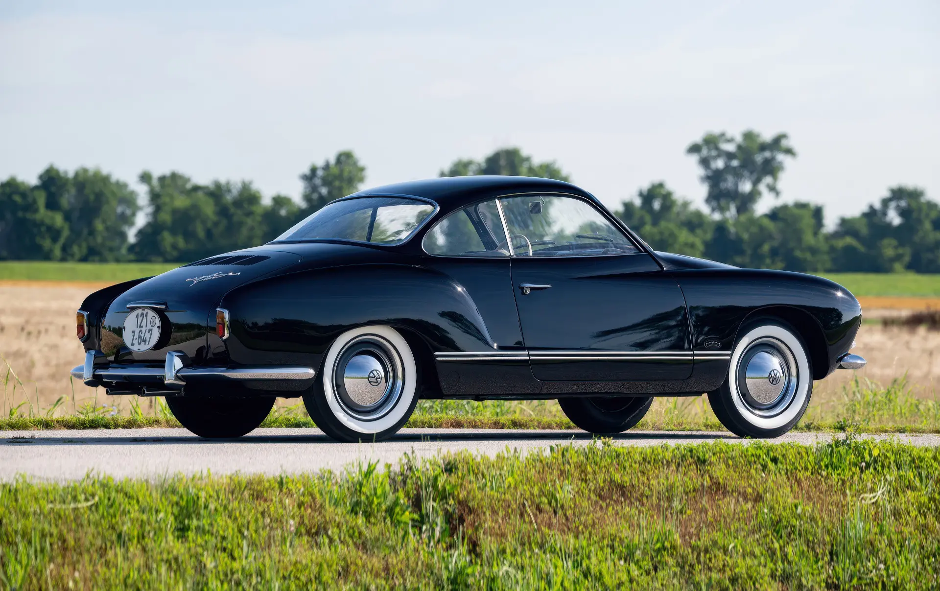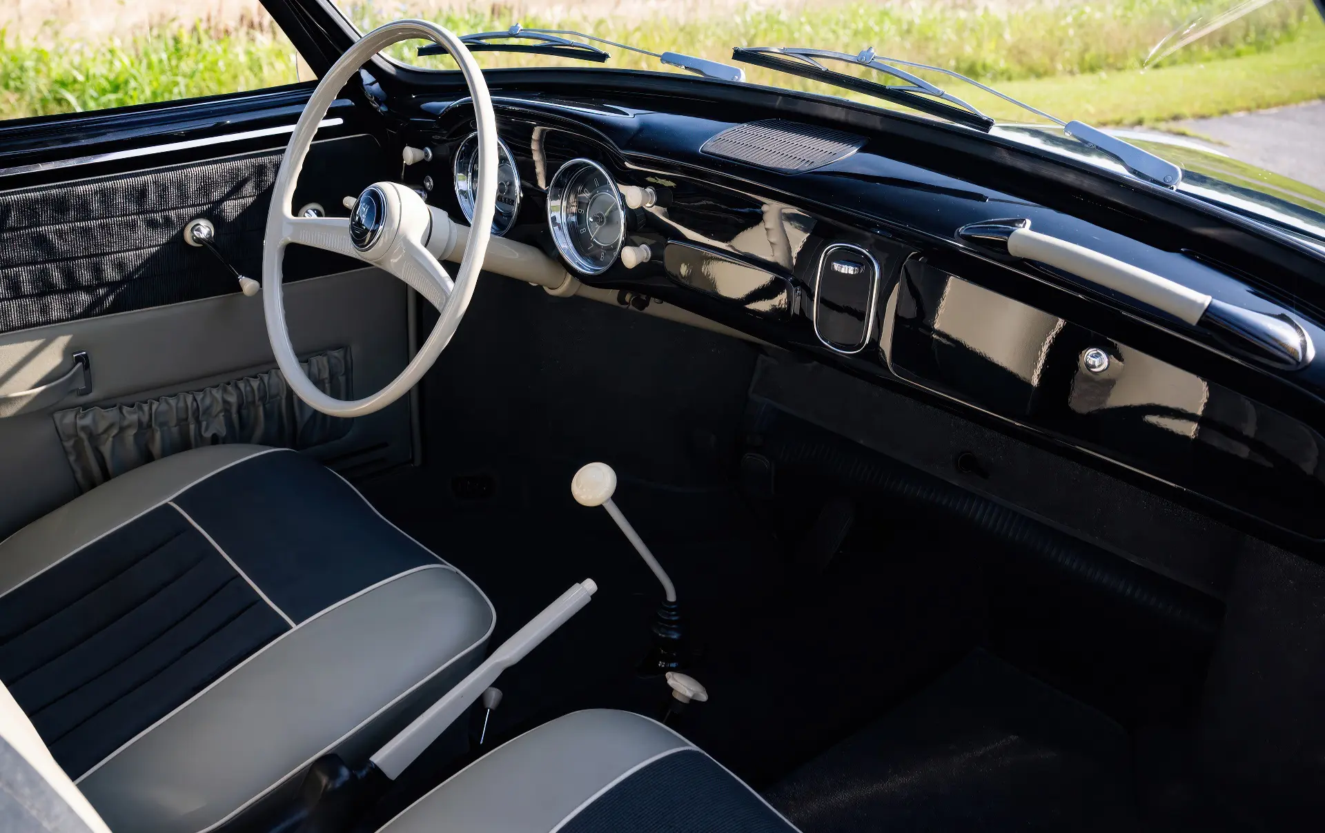 Livrée en 1957, cette Karmann Ghia étincelante est un exemple désirable de faible luminosité, finie à l’origine en noir Toucan sur des sièges en vinyle gris clair avec des inserts en velours côtelé gris foncé. Commandée à Midwestern Volkswagen à Columbus, dans l’Ohio, elle a été livrée à l’usine Volkswagen d’Osnabrück, en Allemagne, à Mary Brown, une institutrice américaine désireuse de voyager en Europe. Un an et 6 000 miles mémorables plus tard, Mme Brown a renvoyé la voiture en Ohio.