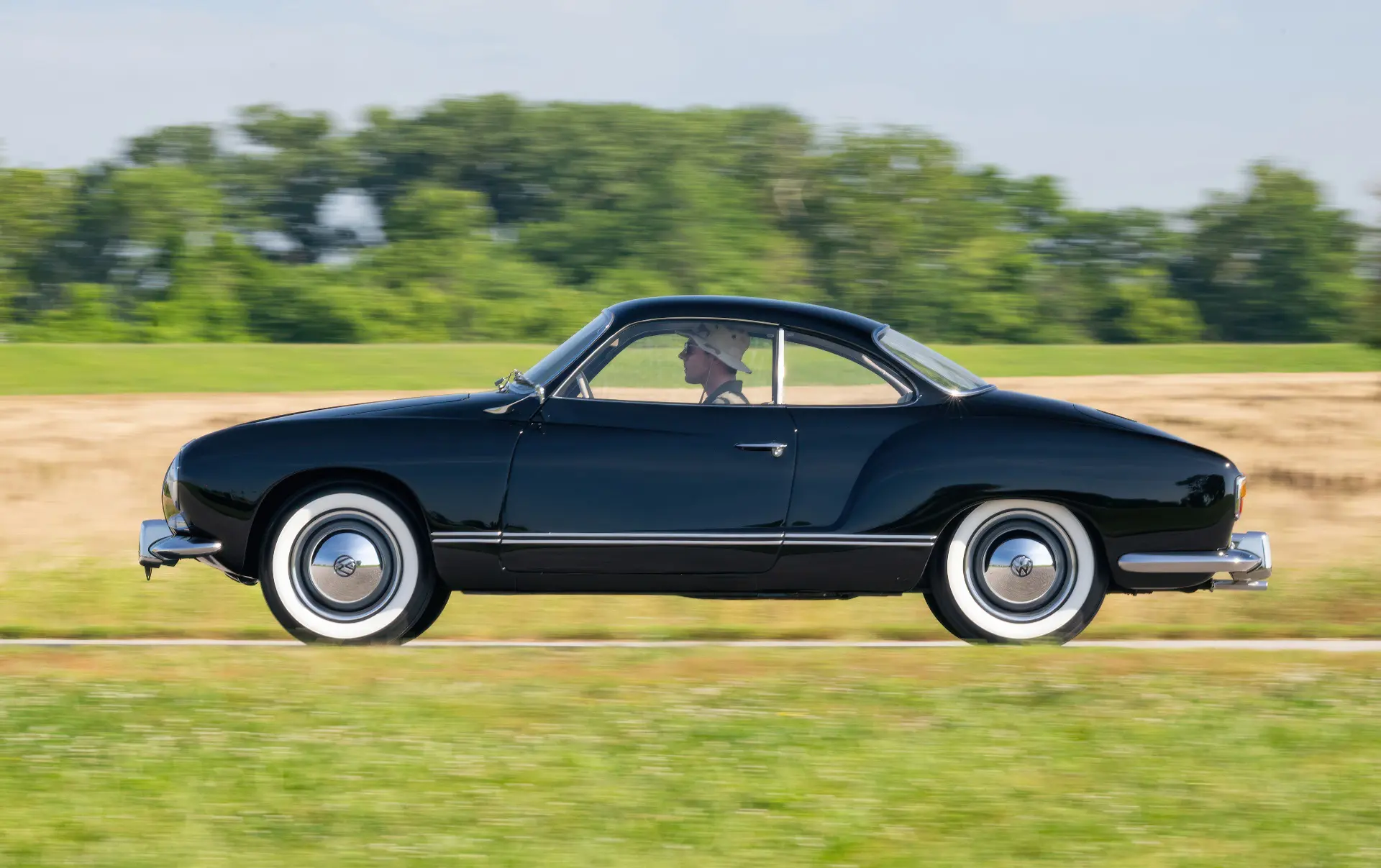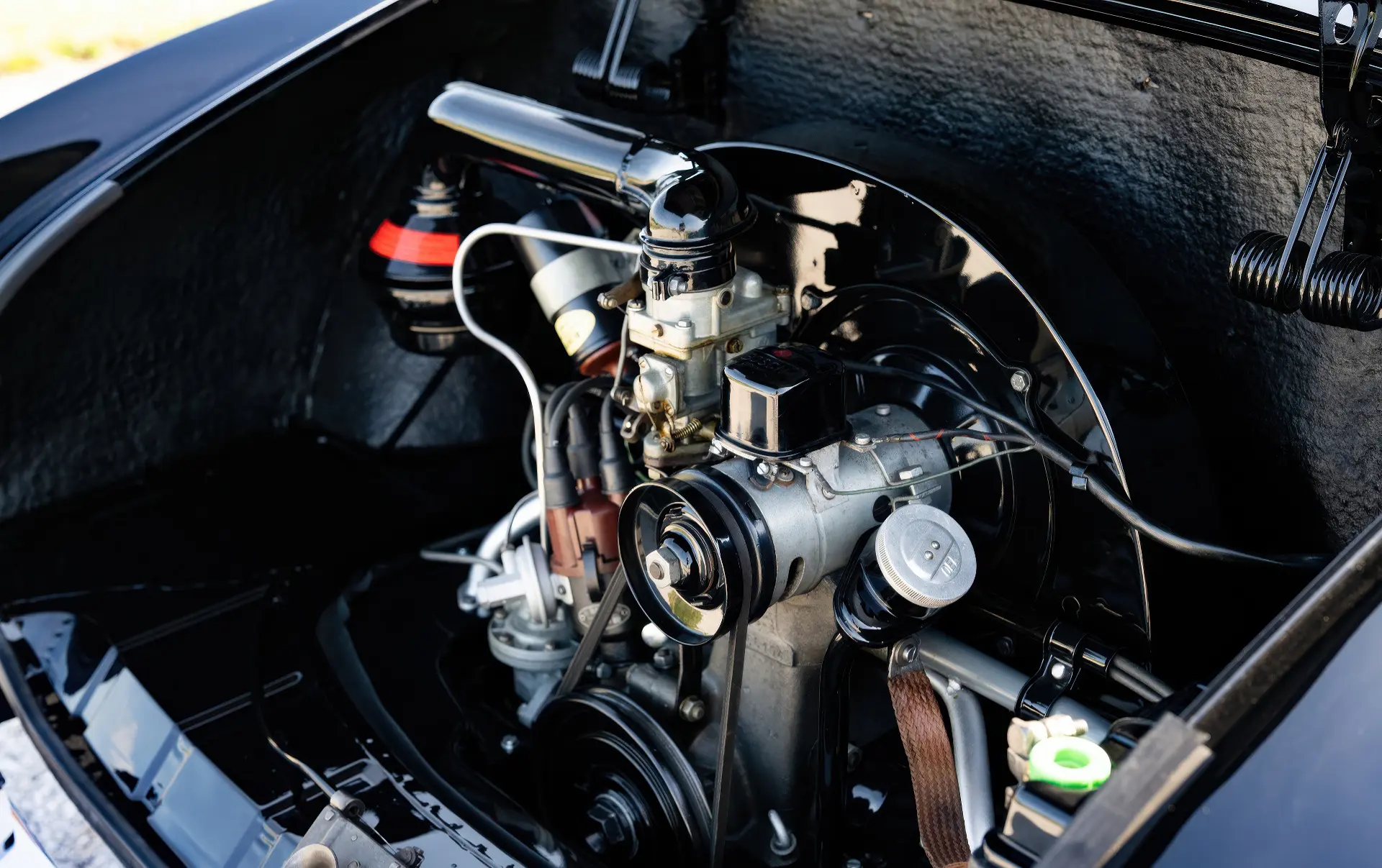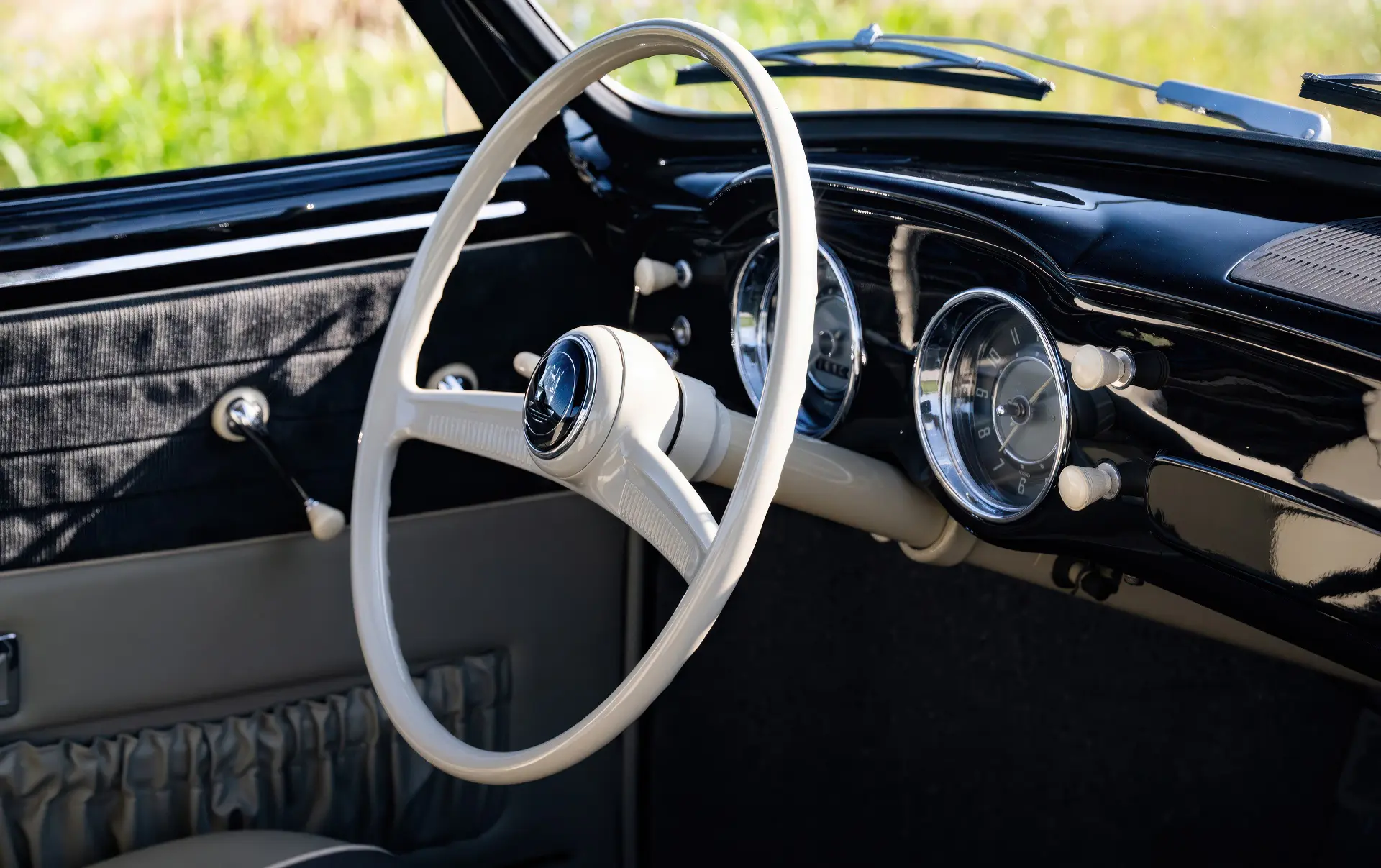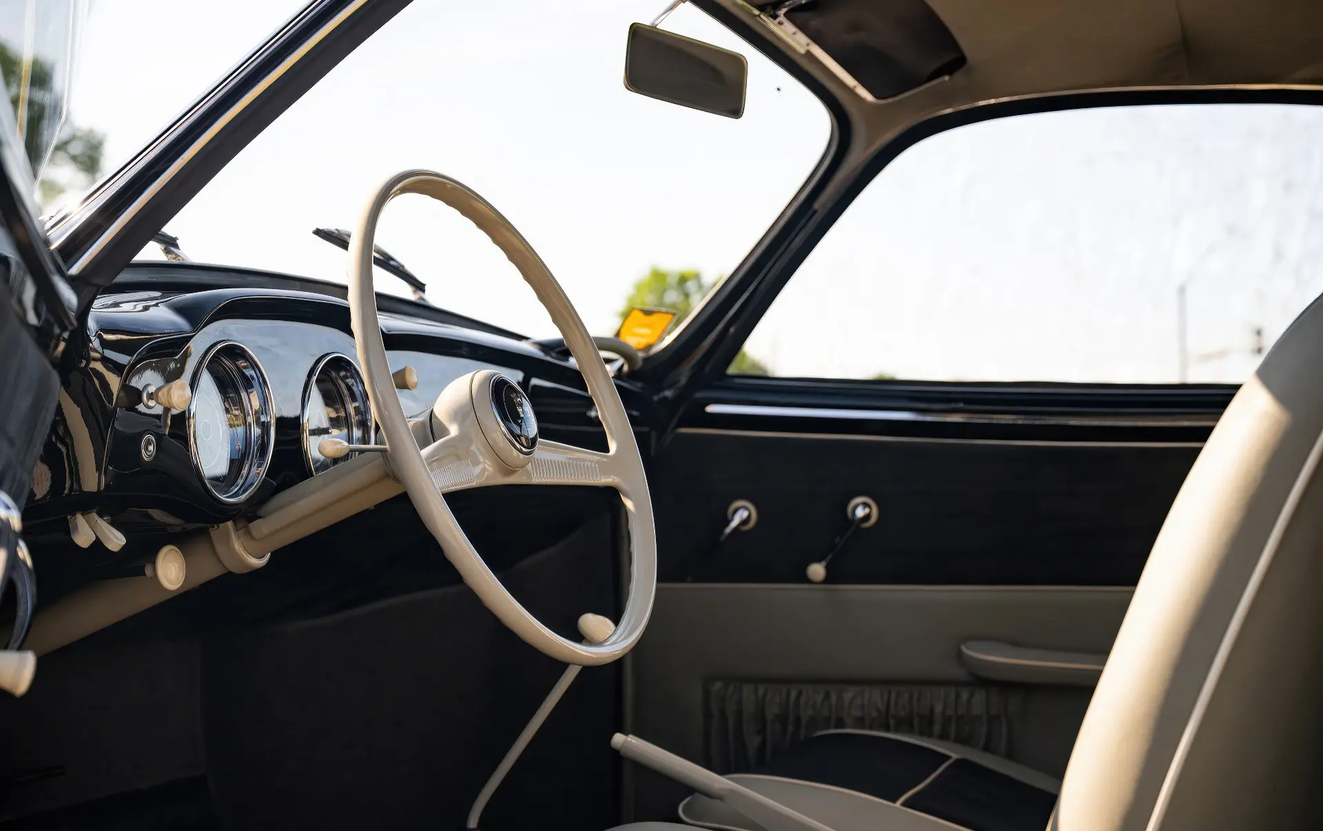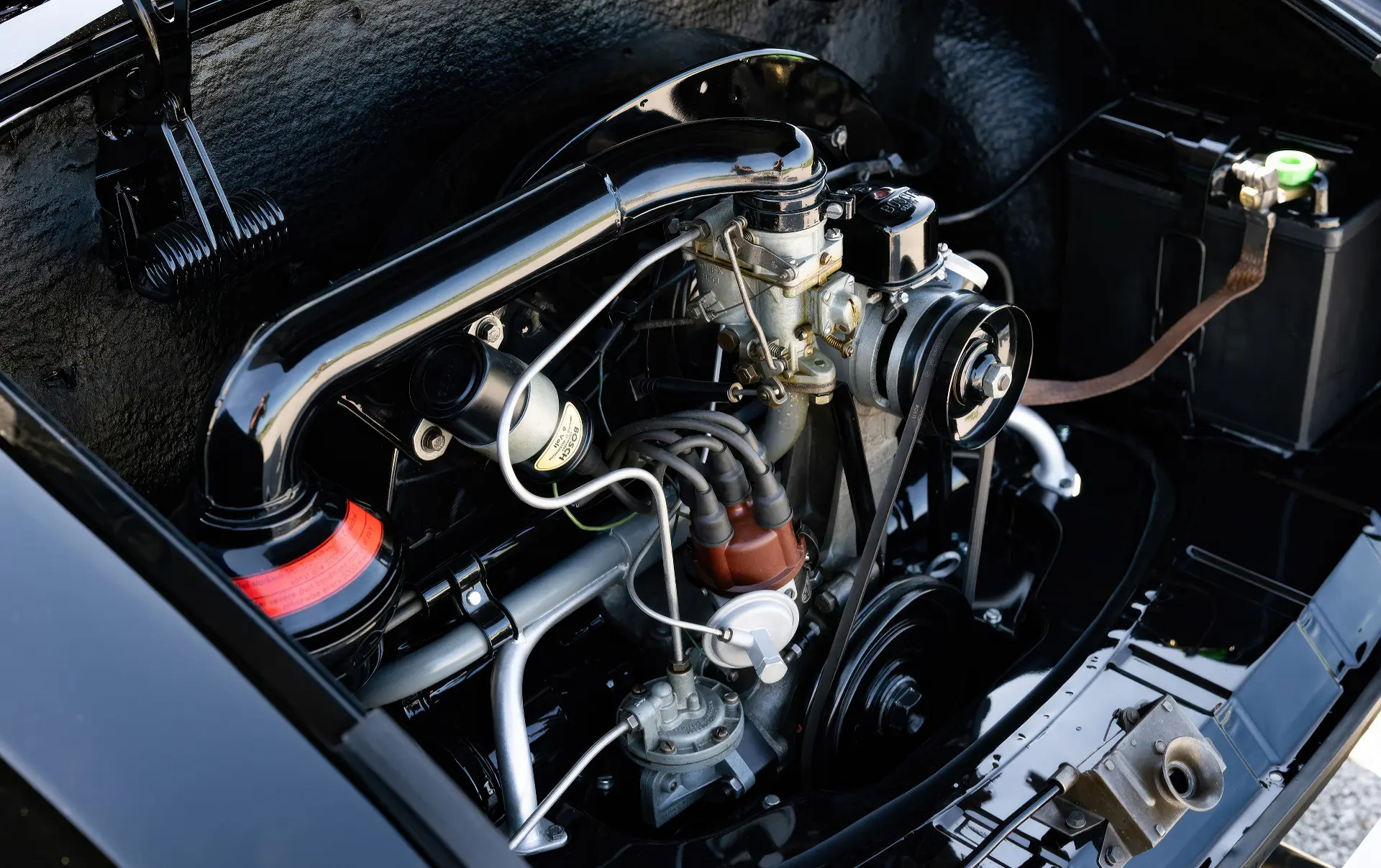 Livrée en 1957, cette Karmann Ghia étincelante est un exemple désirable de faible luminosité, finie à l’origine en noir Toucan sur des sièges en vinyle gris clair avec des inserts en velours côtelé gris foncé. Commandée à Midwestern Volkswagen à Columbus, dans l’Ohio, elle a été livrée à l’usine Volkswagen d’Osnabrück, en Allemagne, à Mary Brown, une institutrice américaine désireuse de voyager en Europe. Un an et 6 000 miles mémorables plus tard, Mme Brown a renvoyé la voiture en Ohio.