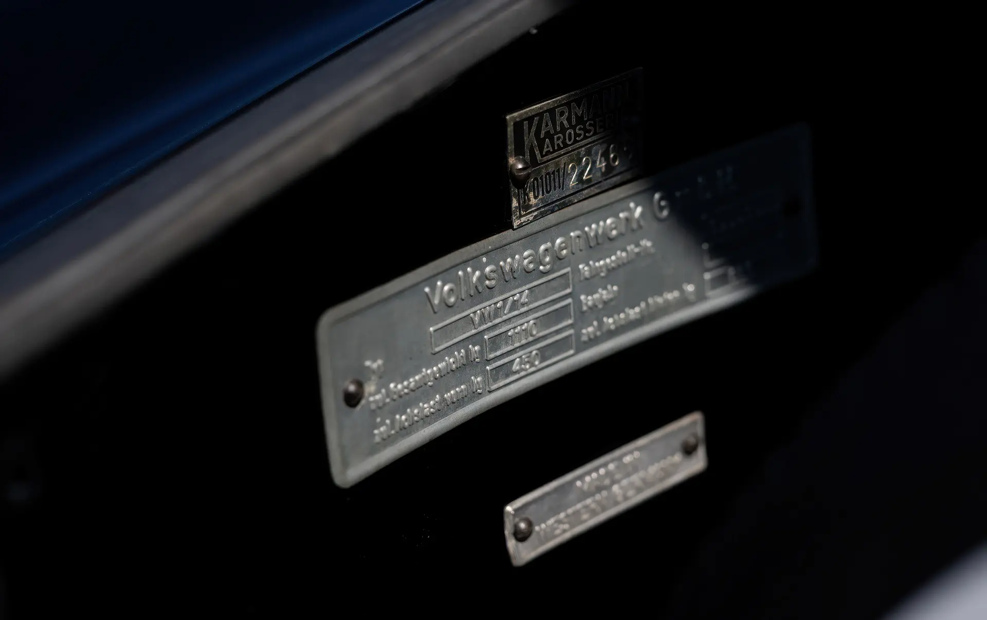 Les numéros de châssis et de moteur de la Karmann Ghia correspondent à ceux de son « Volkswagen Zertifkat« . Elle est proposée avec son dossier d’achat initial, sa carte grise européenne et ses carnets d’entretien détaillés. Elle est également accompagnée d’un journal rédigé par Mme Brown, dans lequel sont consignés les kilomètres qu’elle a parcourus au volant de la voiture.